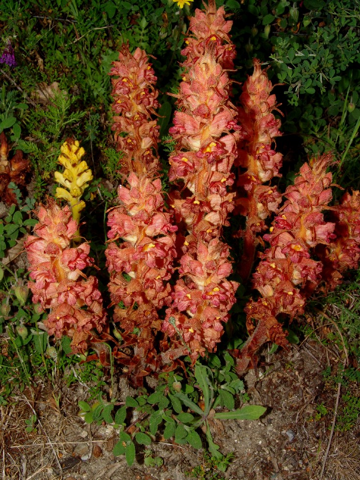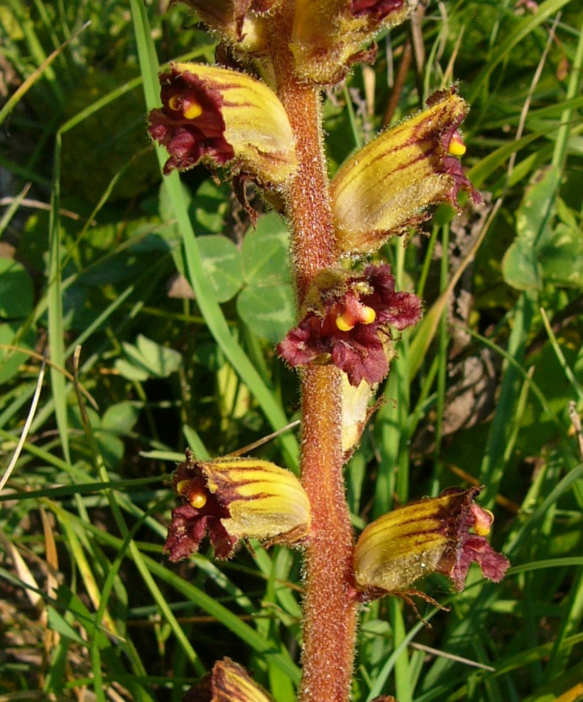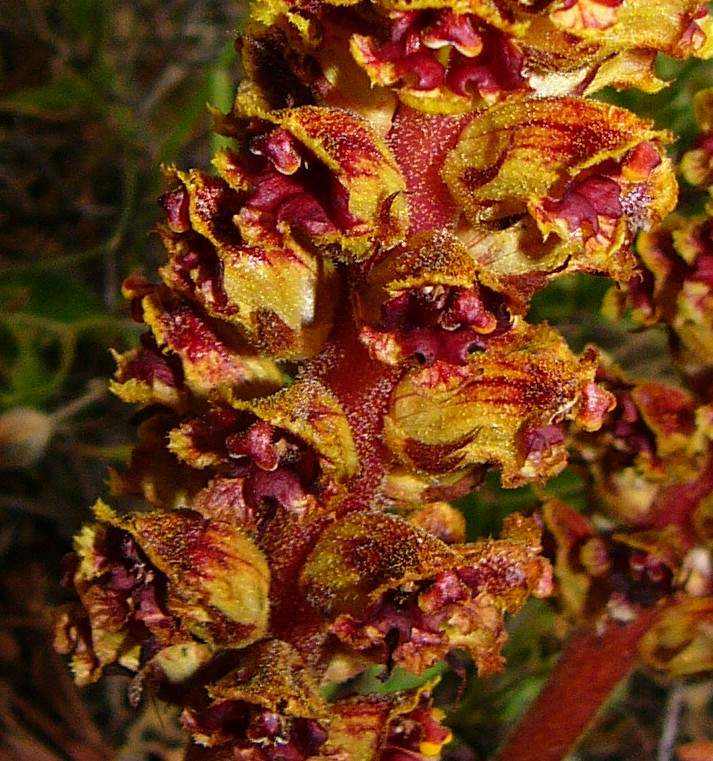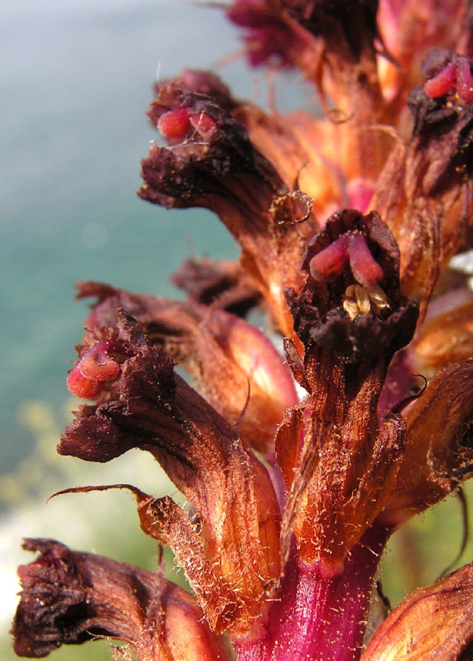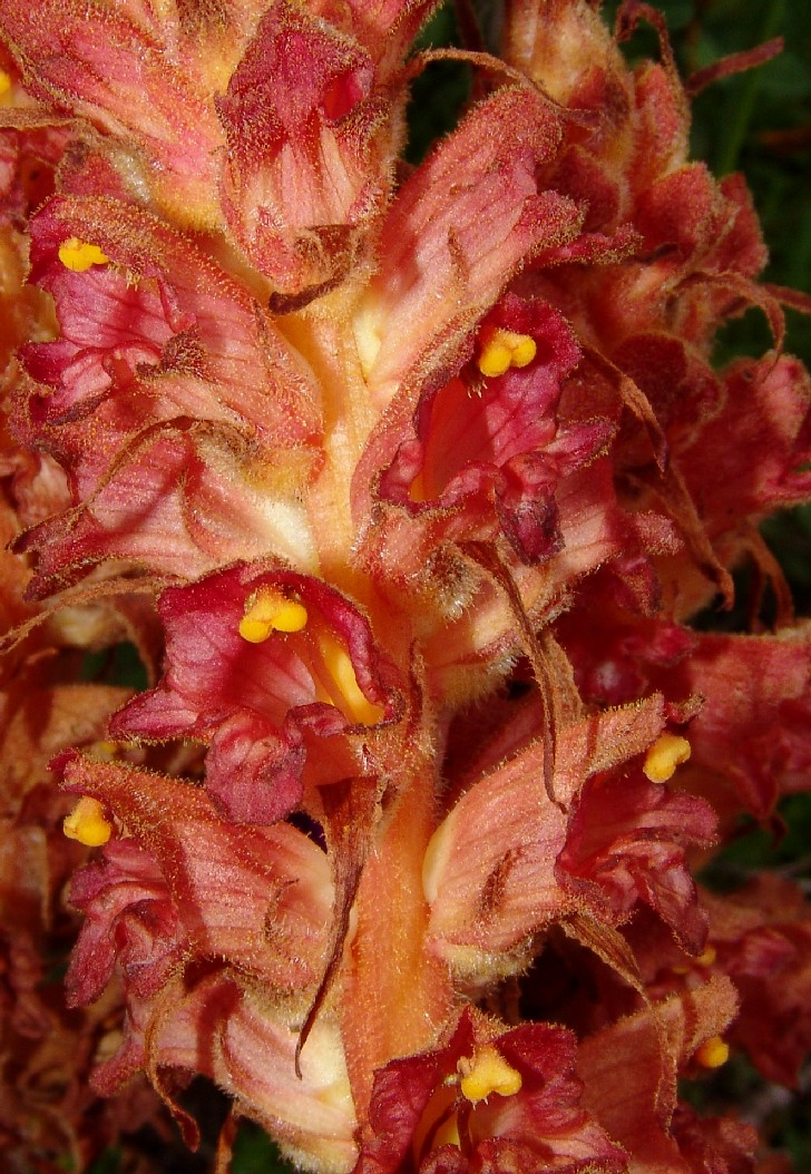 Orobanche - Blüten gelb, braun, violett oder rot, Innenseite der Kronblätter rot, Narbe gelb