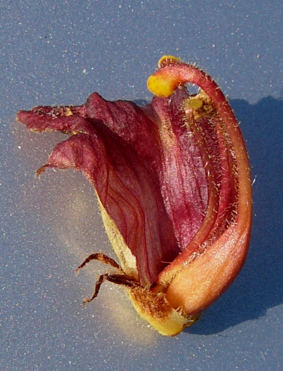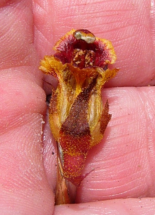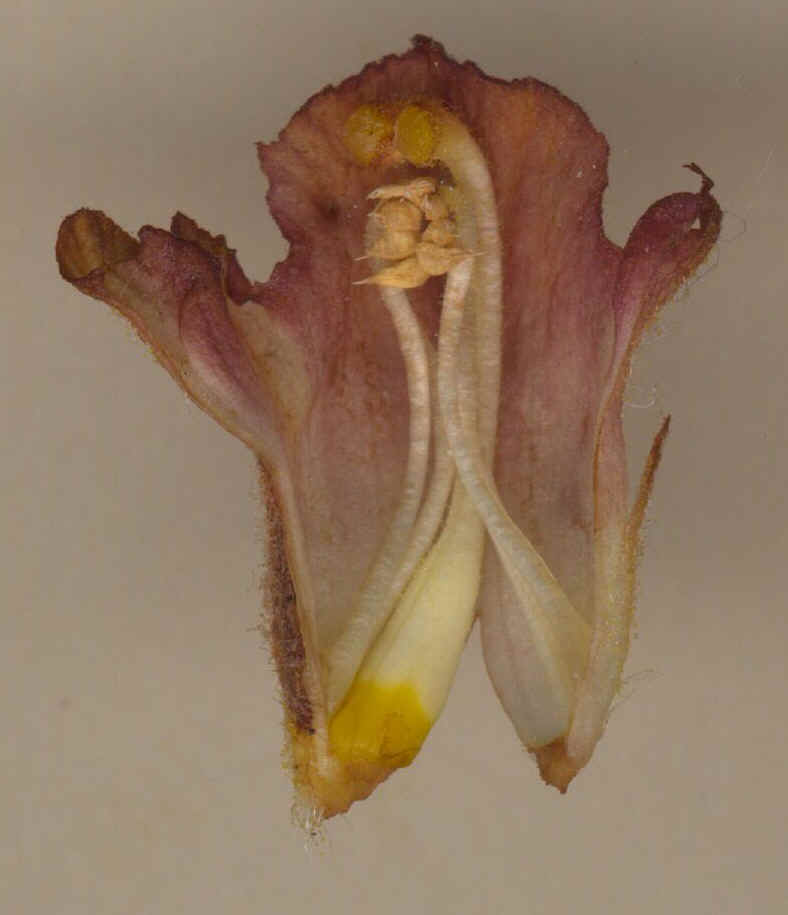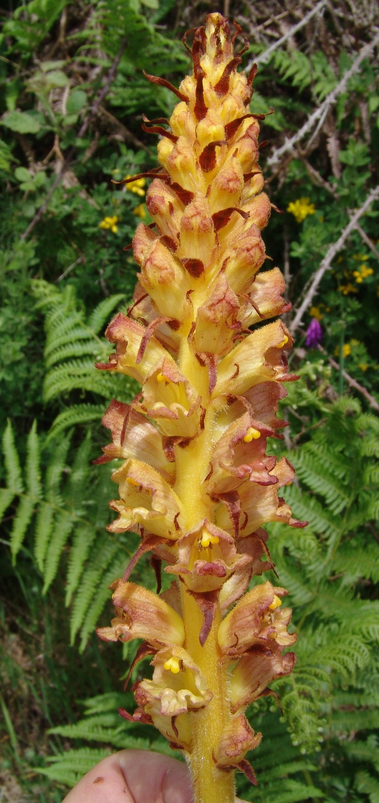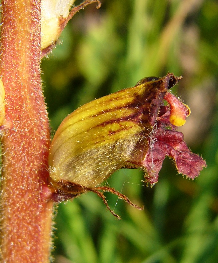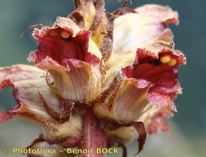 Orobanche - Blüten gelb, braun, violett oder rot, Innenseite der Kronblätter rot, Narbe gelb