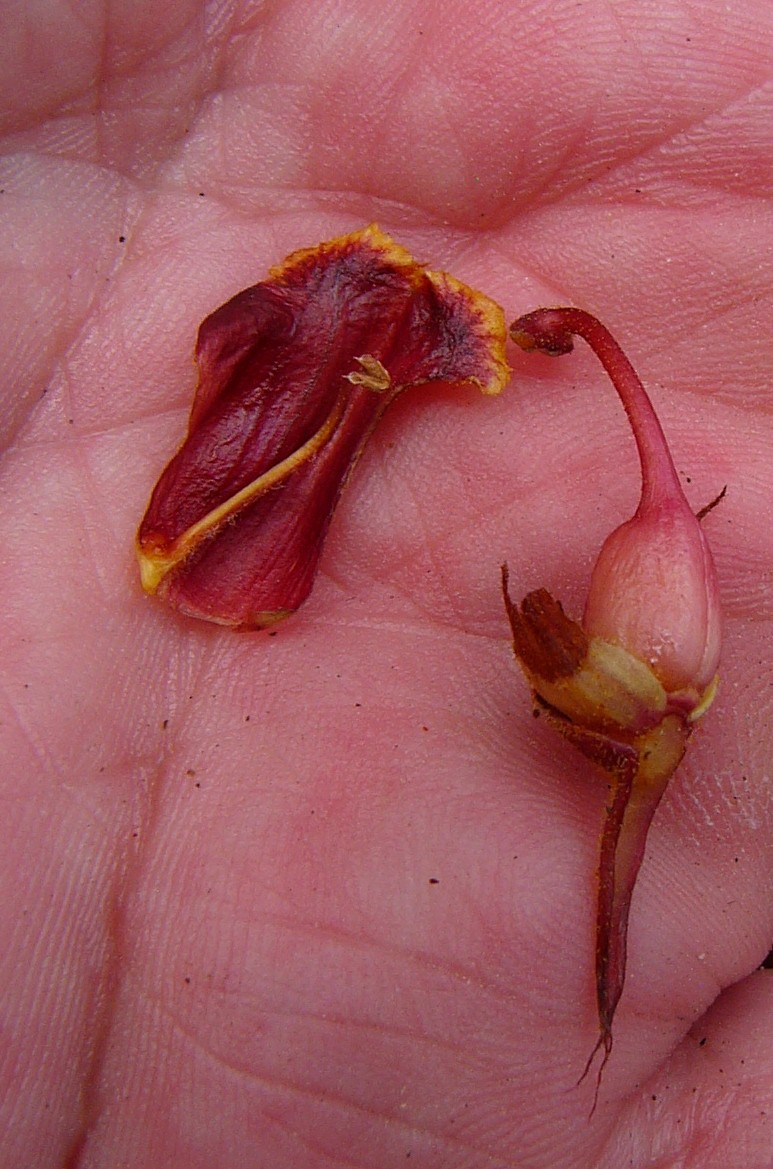Narbe im unteren Teil rot, im vorderen Teil gelb, Staubfäden höchstens 2 mm über dem Grund der Krone schief ansetzend Tragblatt 10 - 200 mm lang, ca. so lang wie die Blüten Kelchsegmente 8 - 15 mm lang, mit 2 pfriemlichen Zähnen Schaft dicht drüsig behaart