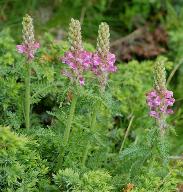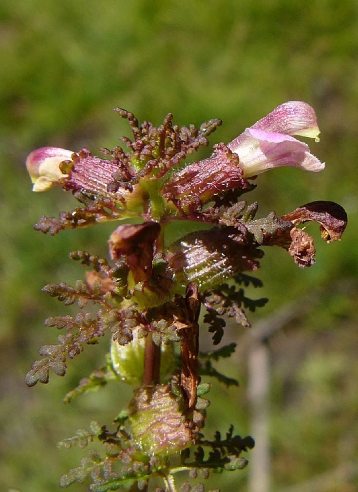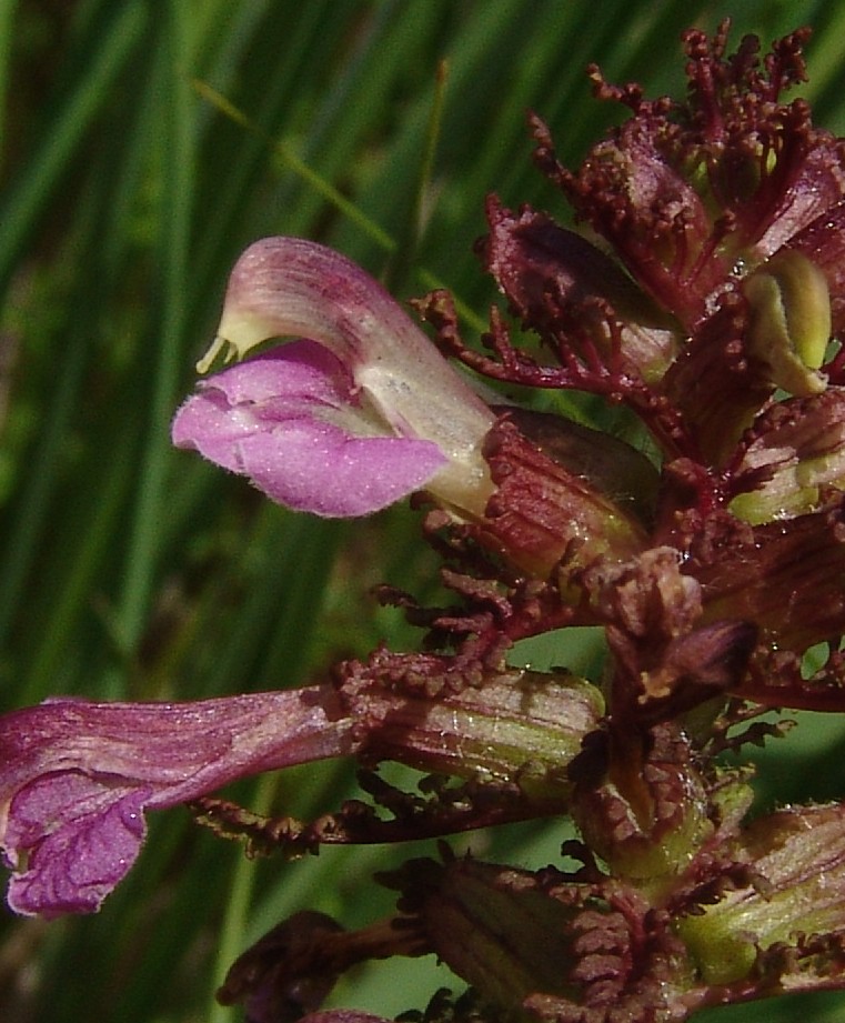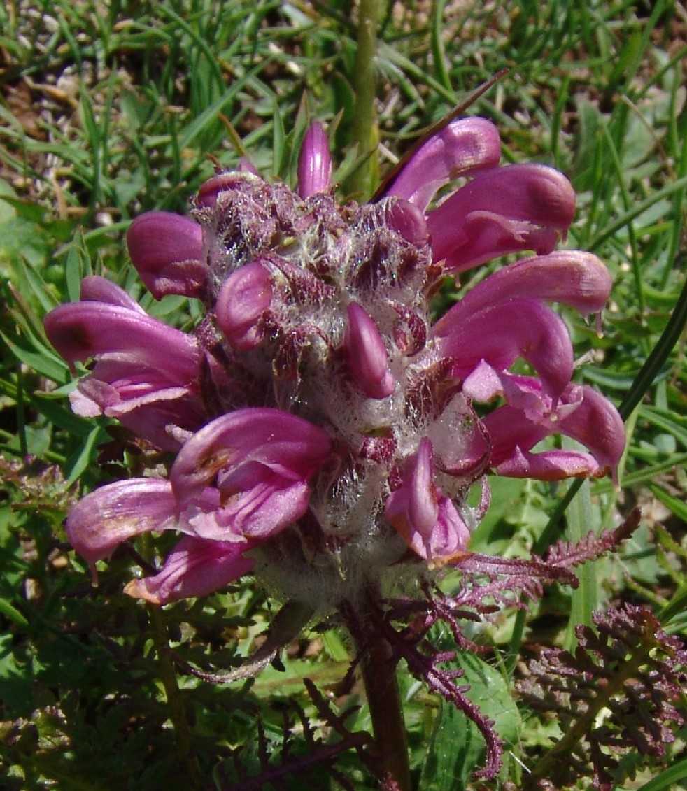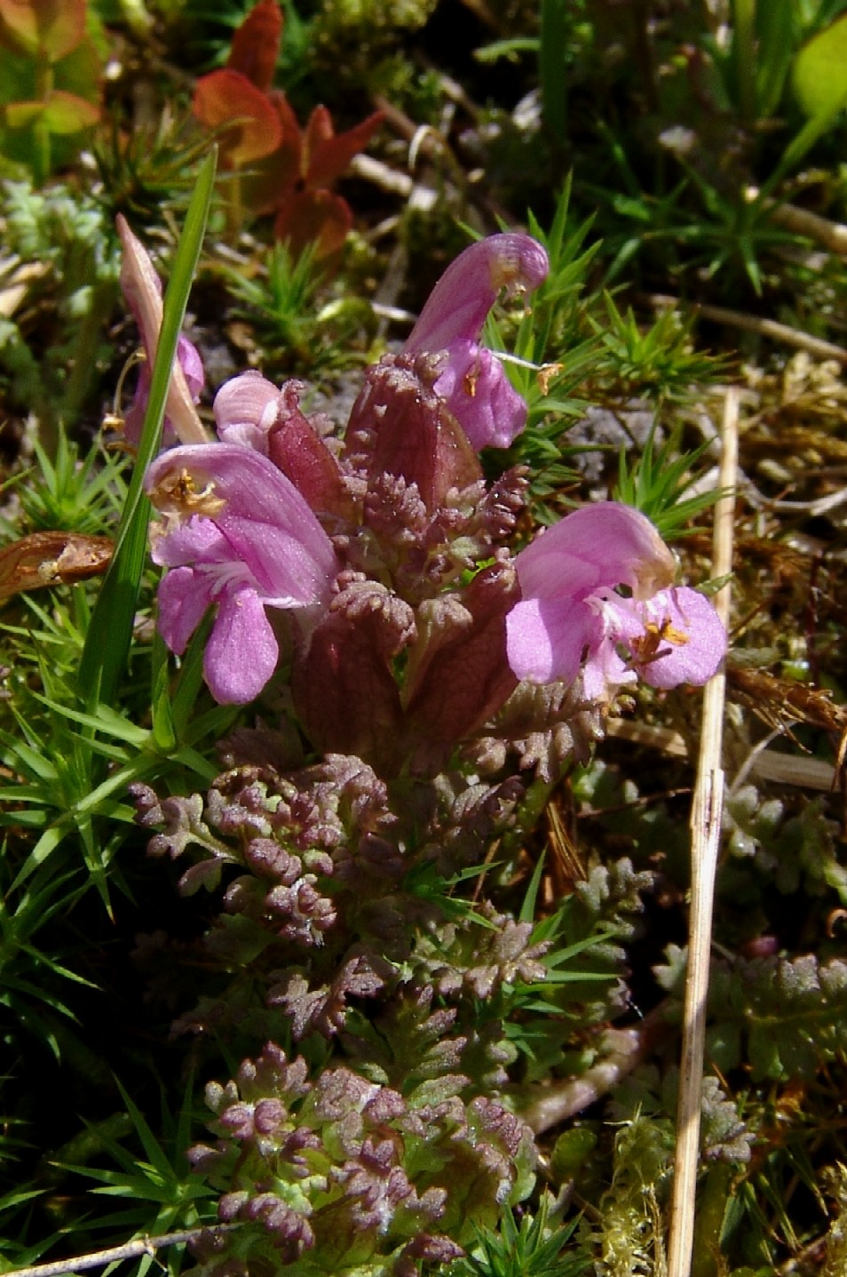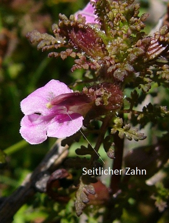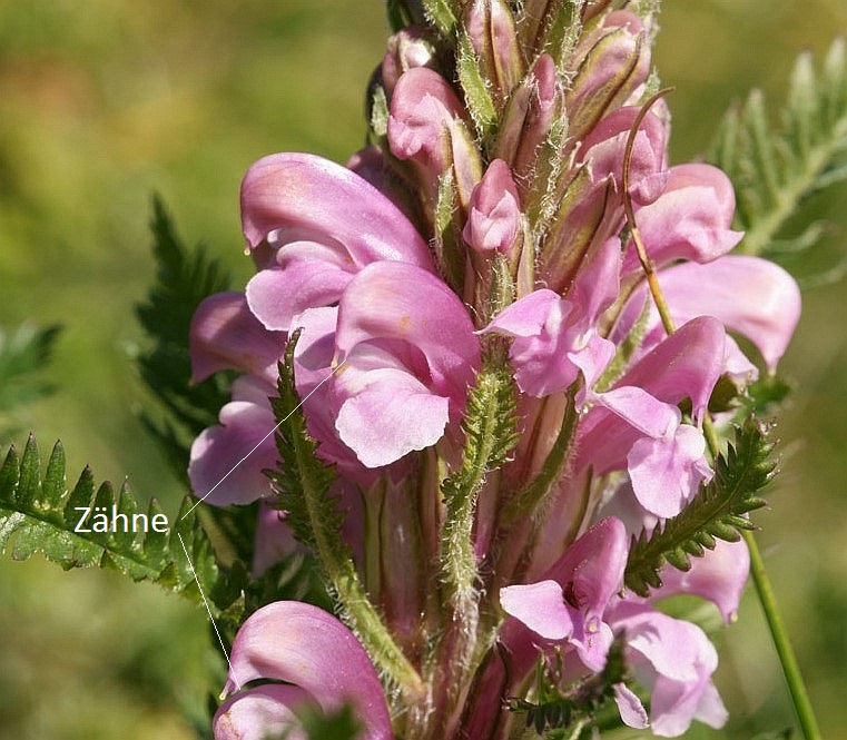 Pedicularis - Blüten rot oder rosa, Oberlippe sichelförmig gekrümmt, mit kurzem Schnabel und seitlichen Zähnen