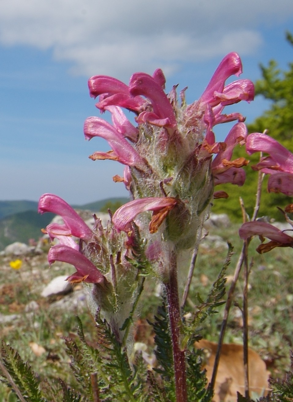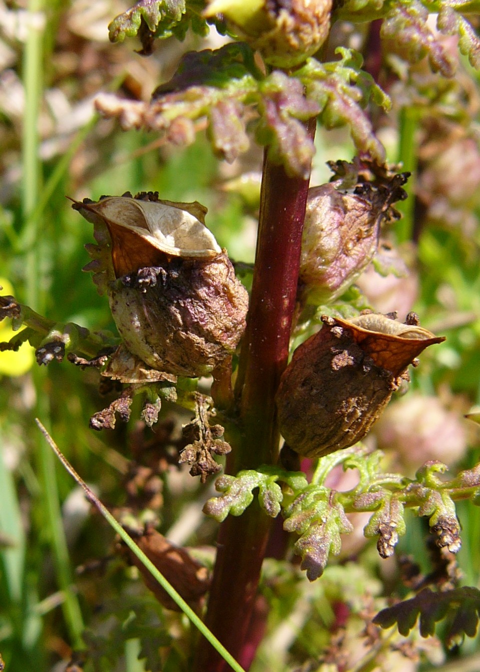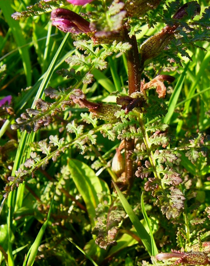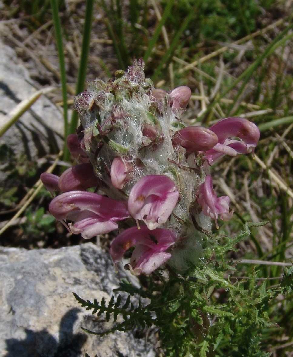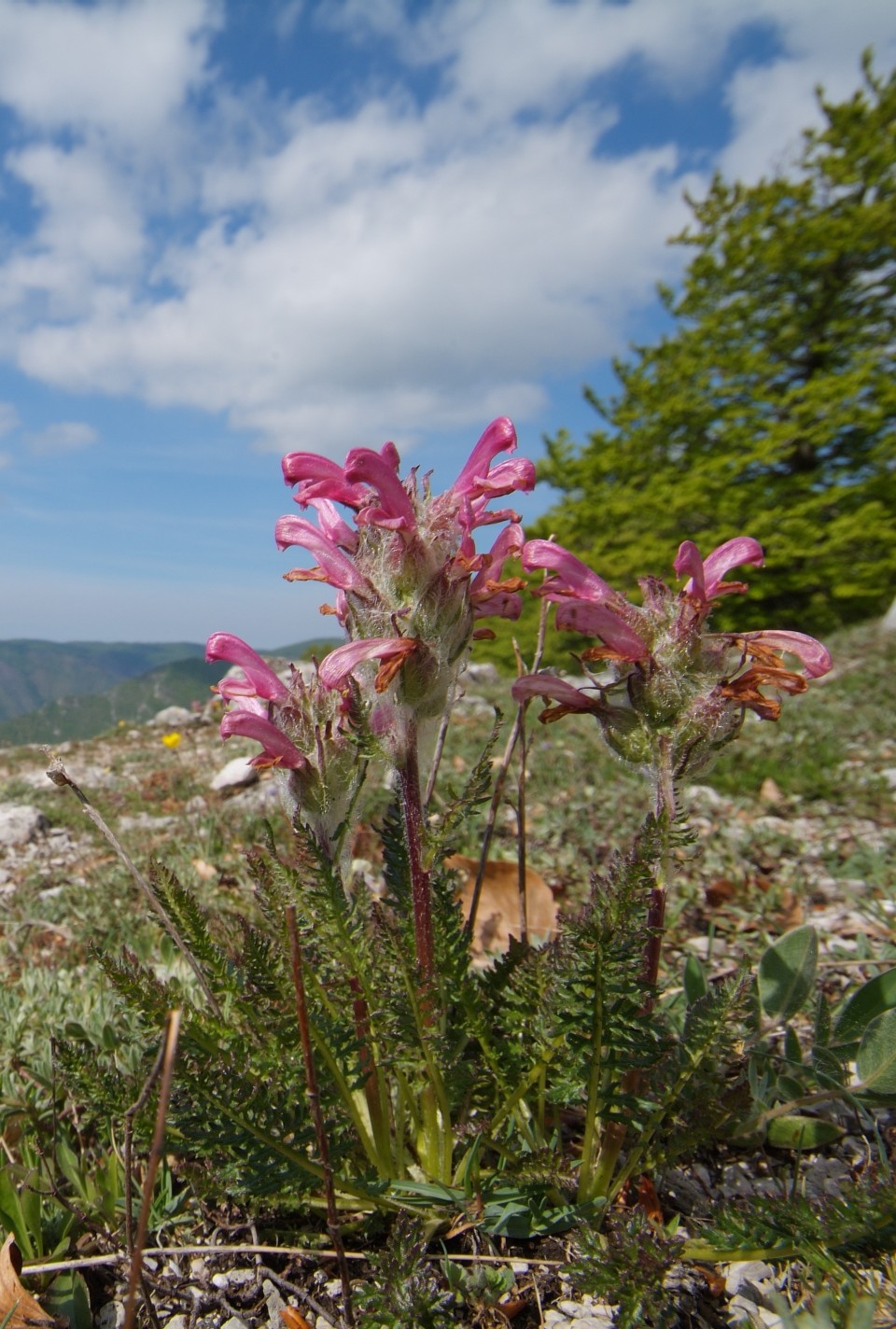 Pedicularis - Blüten rot oder rosa, Oberlippe sichelförmig gekrümmt, mit kurzem Schnabel und seitlichen Zähnen