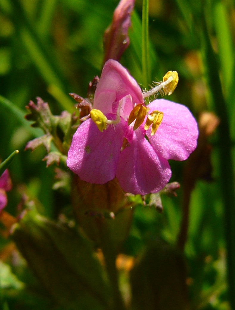 Oberlippe der Krone geschnäbelt, mit 2 nach unten gerichteten spitzen Zähnen Staubblätter aus der Krone ragend, Staubfäden behaart Kelch 5- kantig, mit 5 ungleich gestaltete Zähnen etwas aufgeblasen Blätter gefiedert, Fiedern gezähnt