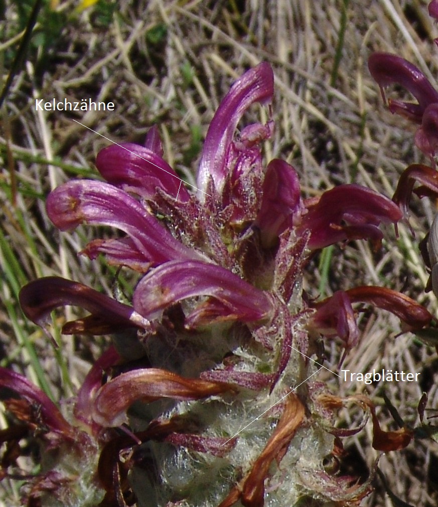 Pflanze 20 - 40 cm groß Blütenstand locker, vielblütig Hochblätter fiederteilig, deutlich länger als der Kelch Blütenstand und Kelch kahl oder zerstreut kurzhaarig, nicht weißwollig Oberlippe kurz geschnäbelt, mit seitlichen Zähnen