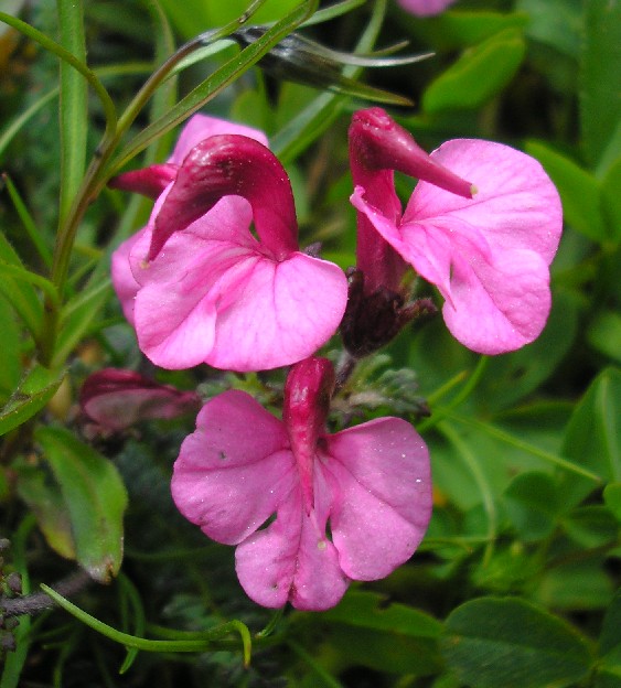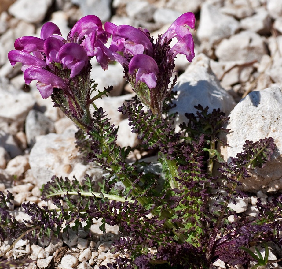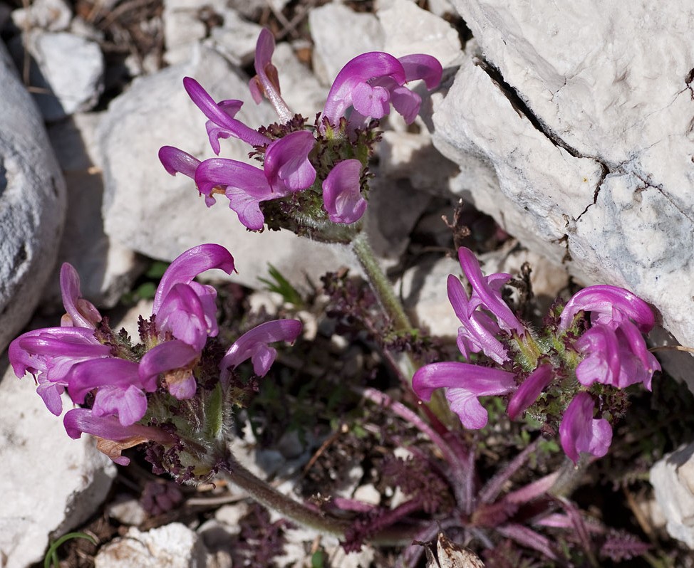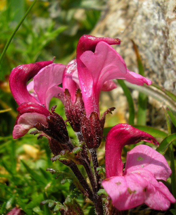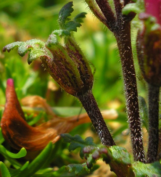 kurzem Stängel, Blütenstand wenigblütig, +/- kopfig, Blüten rot, mit langem Schnabel,