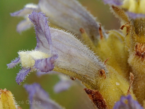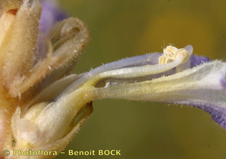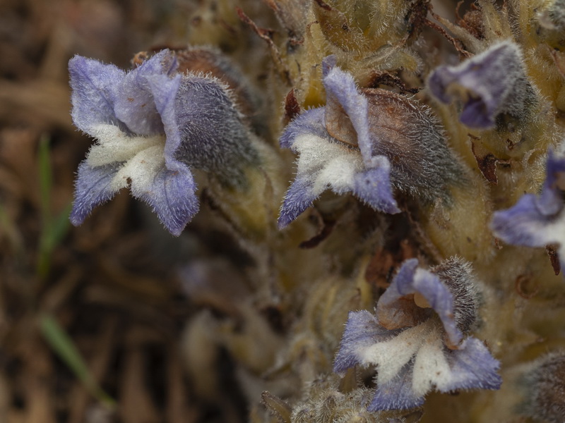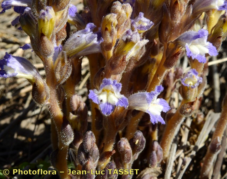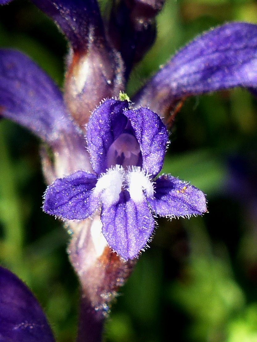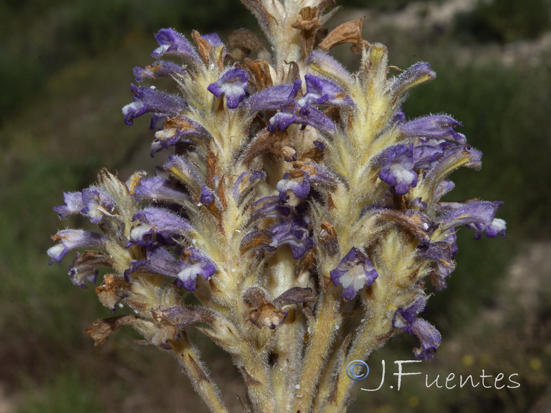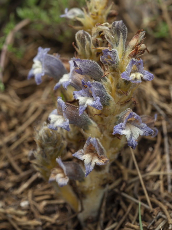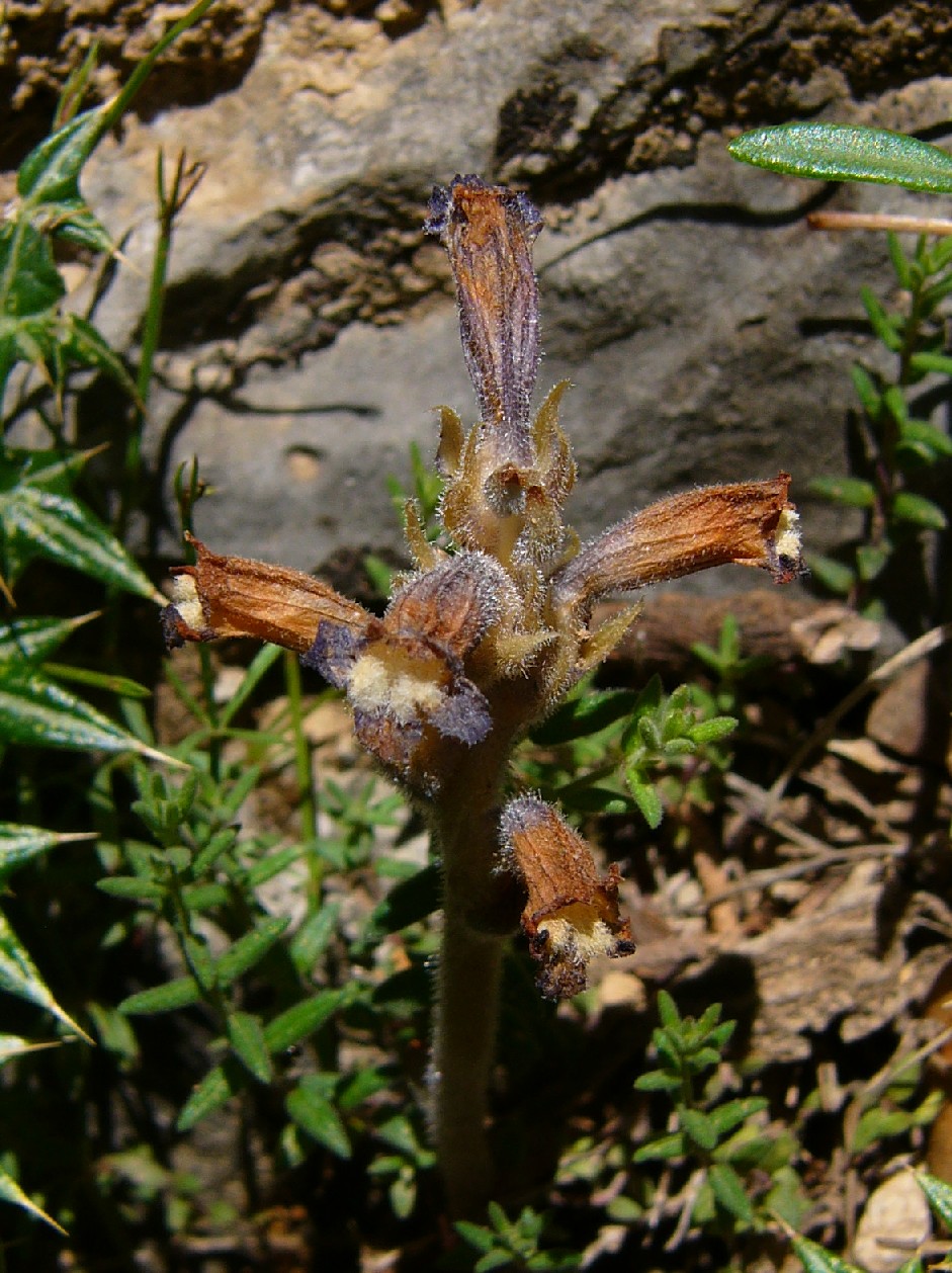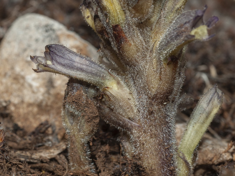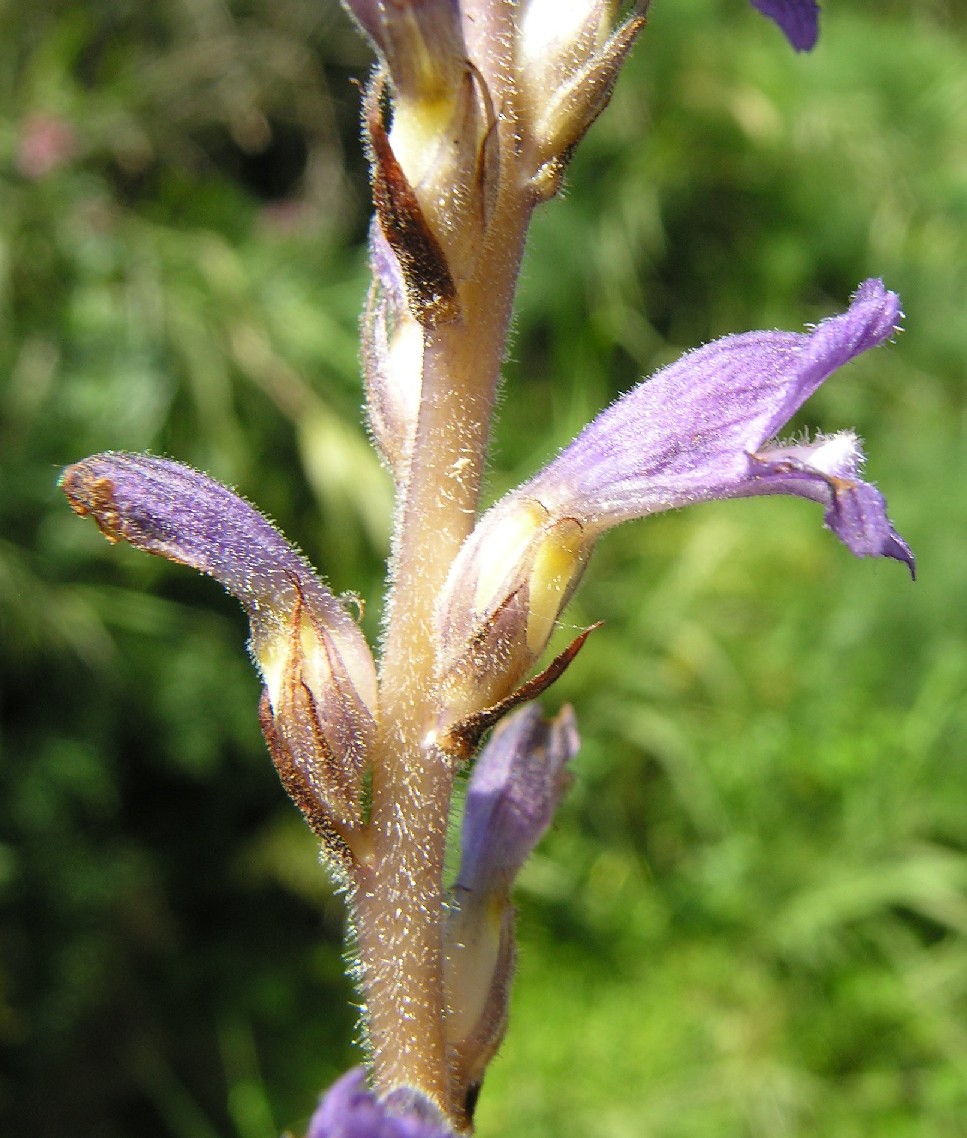 Phelipanche - Pflanze 10 - 35 cm hoch, Krone kräftig blauviolett, Schlund weiß, Kelch und Stängel im oberen Teil nicht weißwollig, Blütenstand mehr als 6 cm lang, vielblütig, Antheren schwach behaart