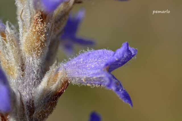 Einige Blüten kurz gestielt, 16 - 20 mm lang, hellblau, 2- lippig, dicht mit langen Haaren besetzt