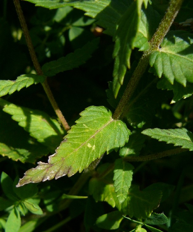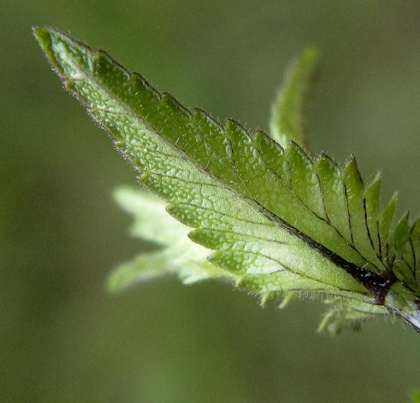 Blätter 13 - 22 mm lang, 6 - 21 mm breit, gezähnt, mit 0,2 - 1,2 mm langen Haaren,