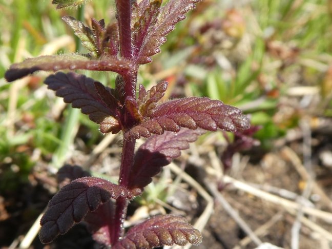 Stängel oft dunkelrotbraun, all- oder einseitig ± mit längeren gegliederten verbogenen, gelegentlich drüsentragenden Haaren besetzt Laubblätter zumeist länger als die Internodien, linealisch bis eilanzettlich, trübgrün, vor allem unterseits oft dunkelrotbraun überlaufen, ± mit kurzen und am Blattgrund manchmal mit längeren drüsenlosen und drüsigen Haaren besetzt