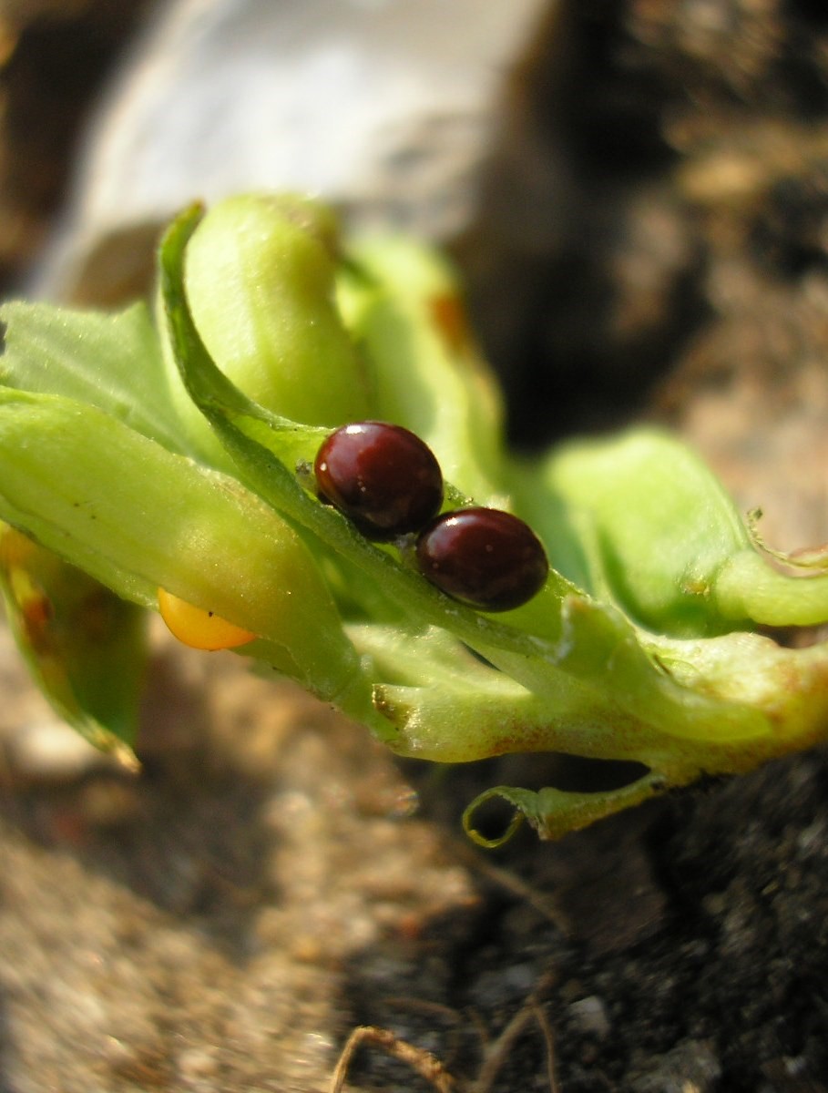 In den Schoten befinden sich schwarze, glänzende Samen mit weißen Anhängseln (Futterkörper = Elaiosomen)