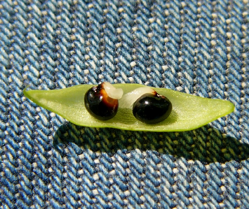 Samen nierenförmig, braunschwarz, glänzend mit Anhängsel (Elaiosom)