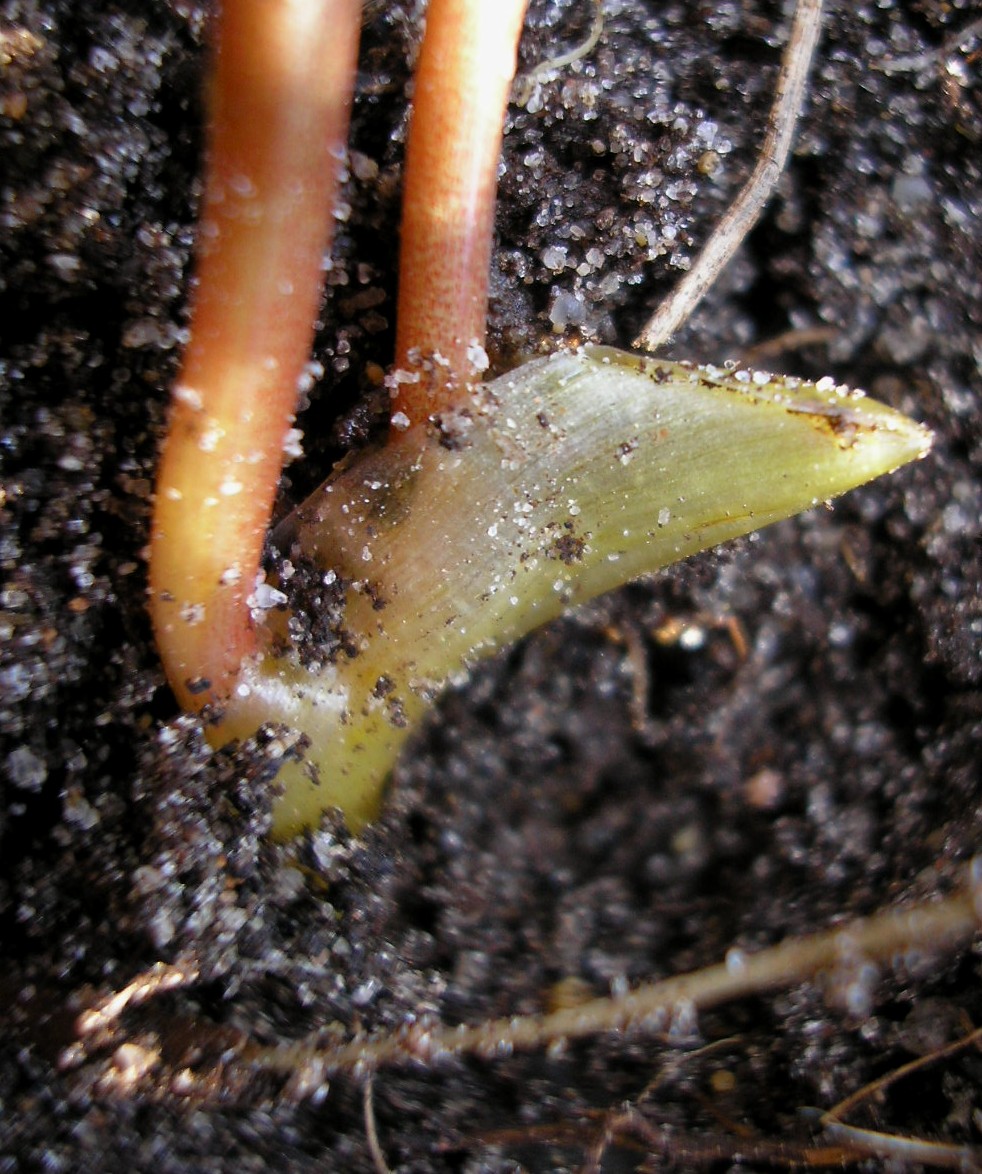 Um das Niederblatt zu finden muss der Stängel teilweise ausgegraben werden