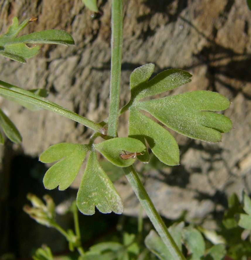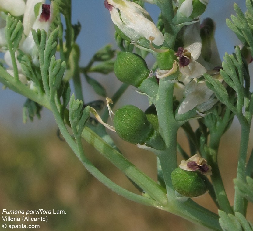Fruchtstiel in etwa so lang wie die Frucht, Frucht leicht gekielt, meist höher als breit Blätter stärker bereift als bei F. officinalis, Blattzipfel bis 4 mm breit, nicht rinnig