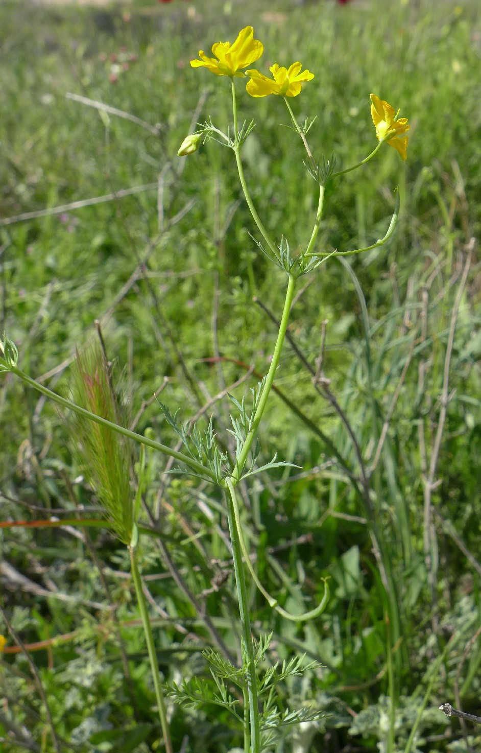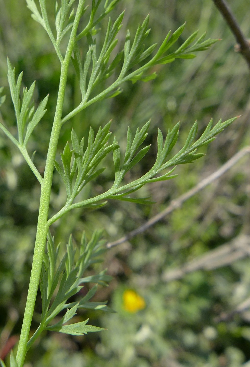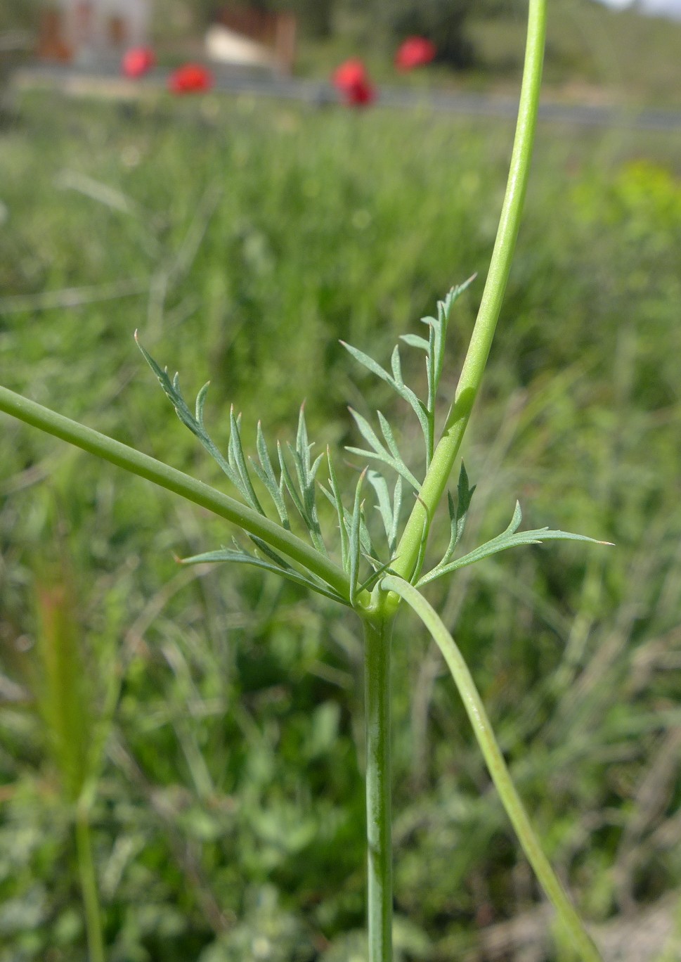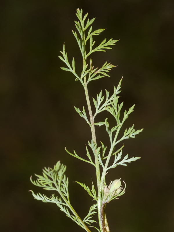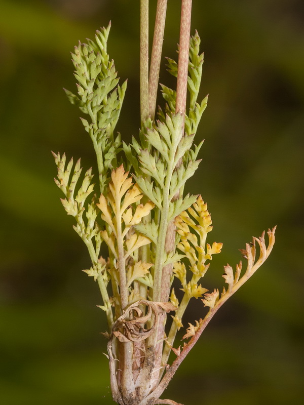 Grundblätter blaugrün, 2 - 3- fach gefiedert, mit linealischen, spitzen Fiederabschnitten