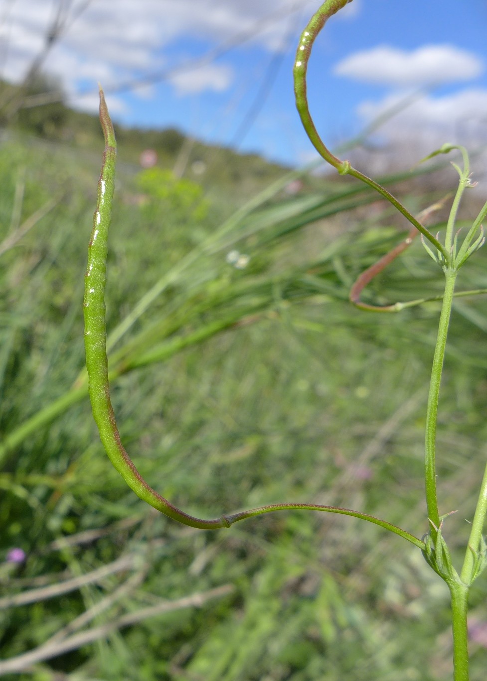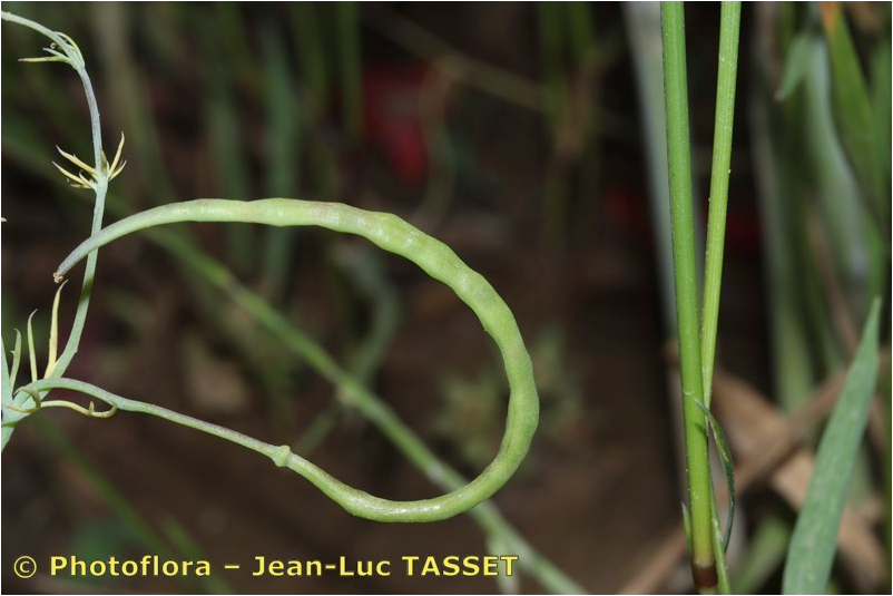 Früchte länglich, spitz, +/- aufrecht, gebogen, schwach in Septen gegliedert, 2 mm breit