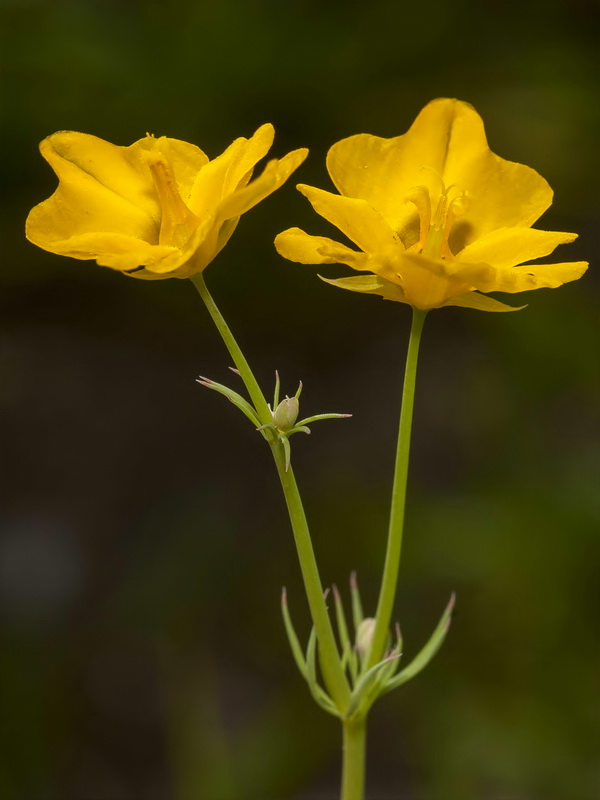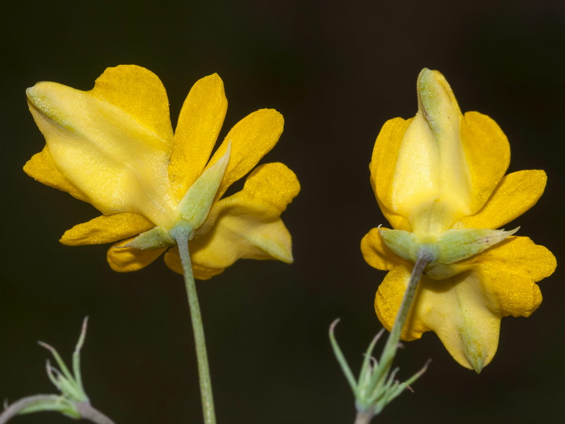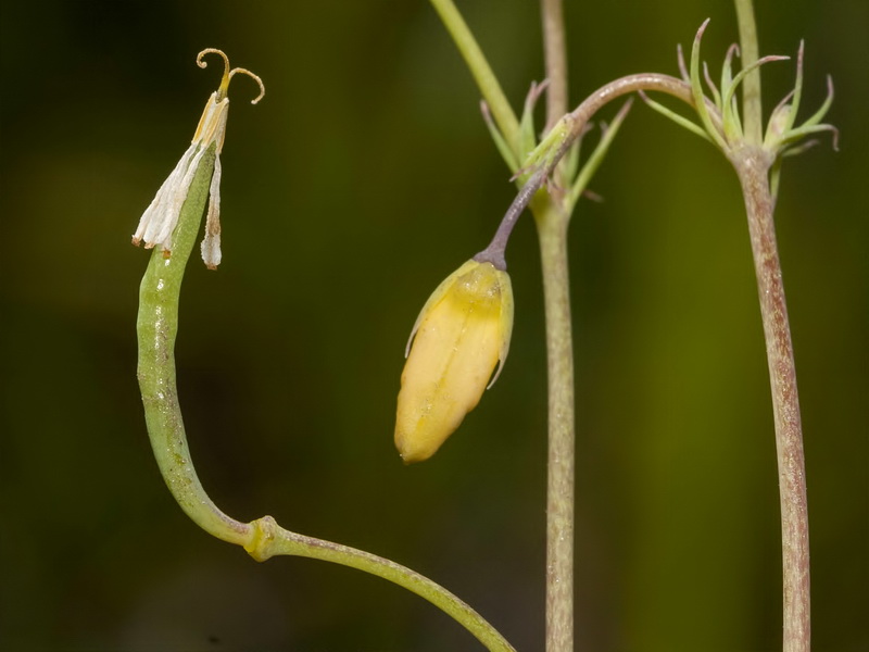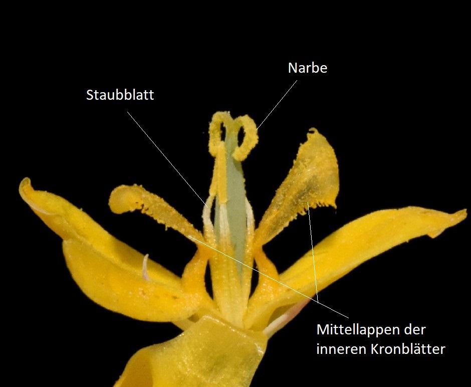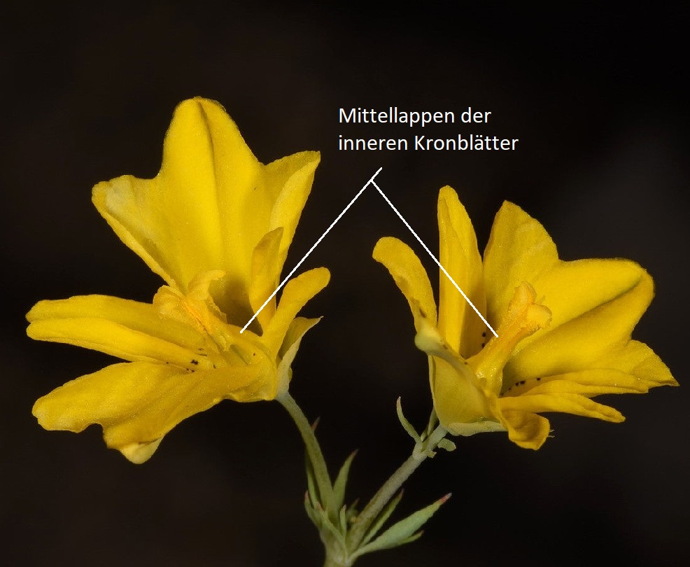 Blüten Blüten dottergelb mit 4 Kronblättern: die äußeren beiden Kronblätter dreilappig, wobei der mittlere Lappen größer als die beiden seitlichen Lappen ist, die beiden inneren Kronblätter tief geteilt, mit je 2 +/- ausgebreiteten, schlanken und ganzrandigen Lappen (ähnelt dem Bild eines Chromosoms!), schwarz gepunktet