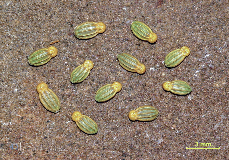 Früchte in Form einer "Baby- Mumie", 3 - 4 mm lang, 2- samig, Griffel schnell abfallend, jederseits mit 3 mittleren Rippen, mittlere Rippen kaum schmaler als die Randrippen