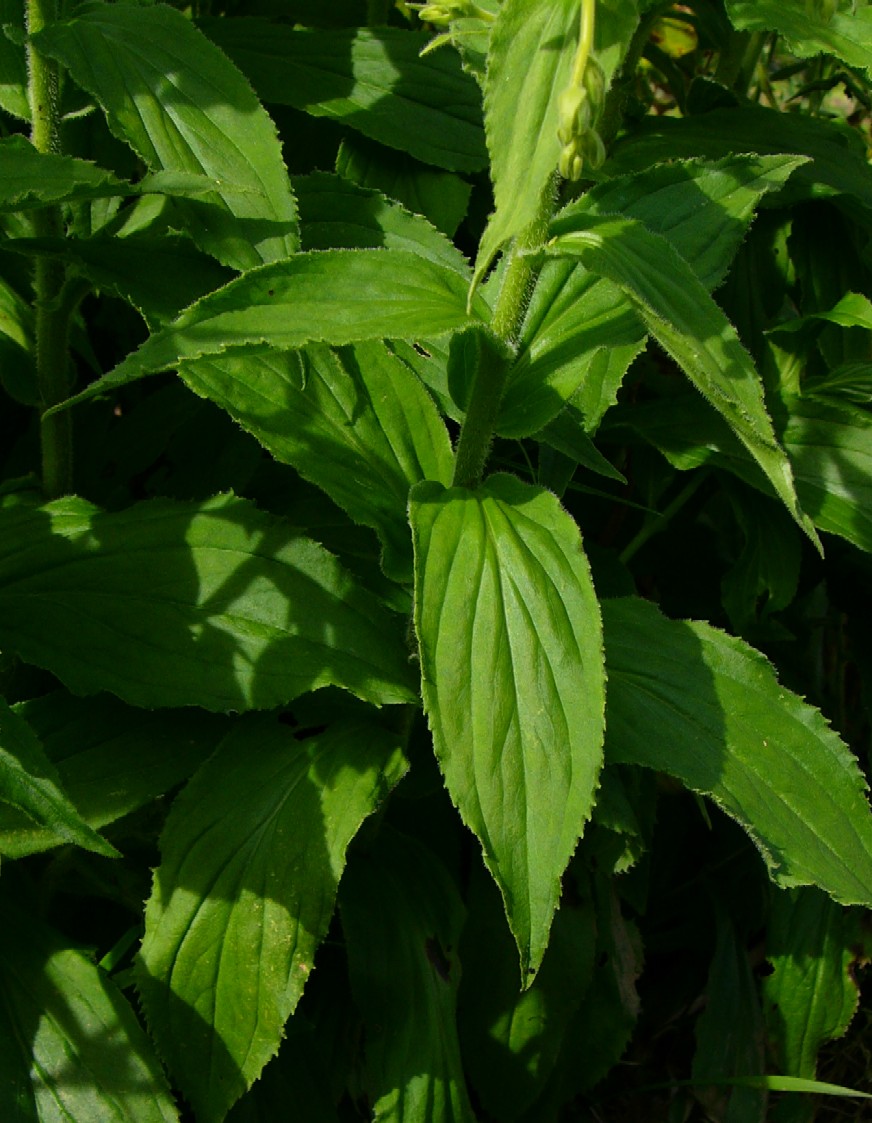 Blätter wechselständig, Rand unregelmäßig gesägt, ohne gebuckelte Felder auf Oberseite Stängel und Blätter Blätter behaart
