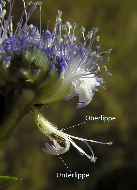 Oberlippe fehlend oder klein, mit 2 winzigen Zähnchen, Unterlippe zungenförmig, 3- zähnig, viel länger als die Oberlippe, die 4 Staubblätter und der schlanke Griffel ragen aus der Blüte, Staubbeutel blauviolett, Staubfäden 3,5 mm lang, Narbe zweilappig, Kelchglockig, borstig bewimpert, Tragblätter der Blüte pfriemlich, borstig behaart