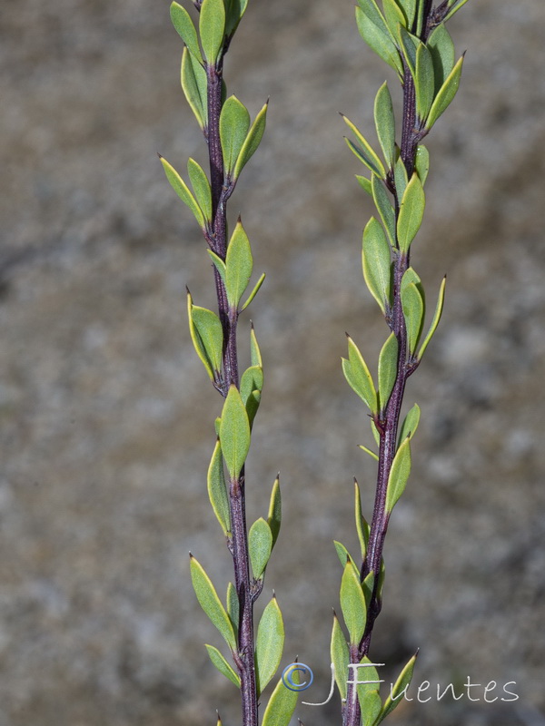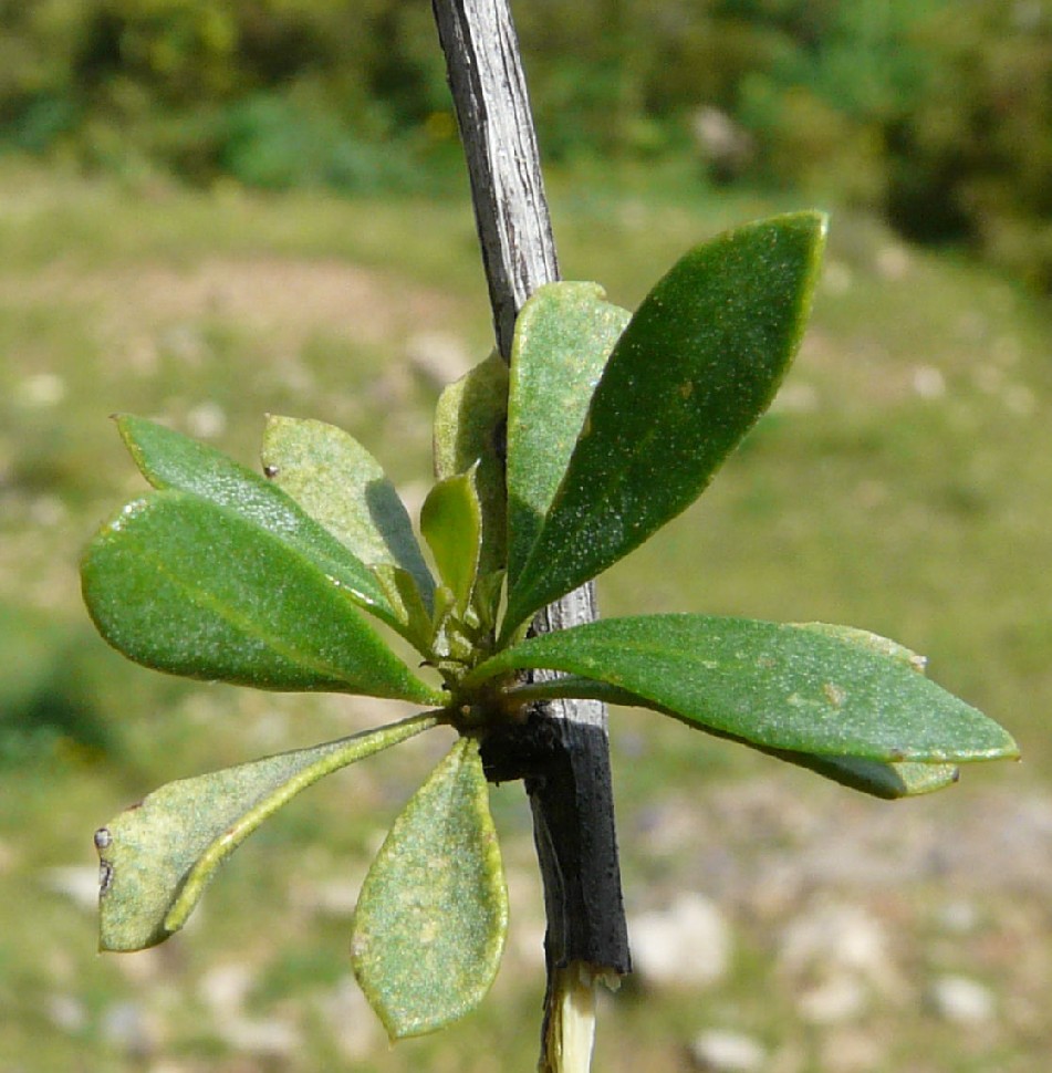Blätter lederig, 15 - 25 mm lang, 3 - 6 mm breit, spatelförmig bis elliptisch, ganzrandig, spitz, oft mit 0,5 mm langem Stachelspitzchen,