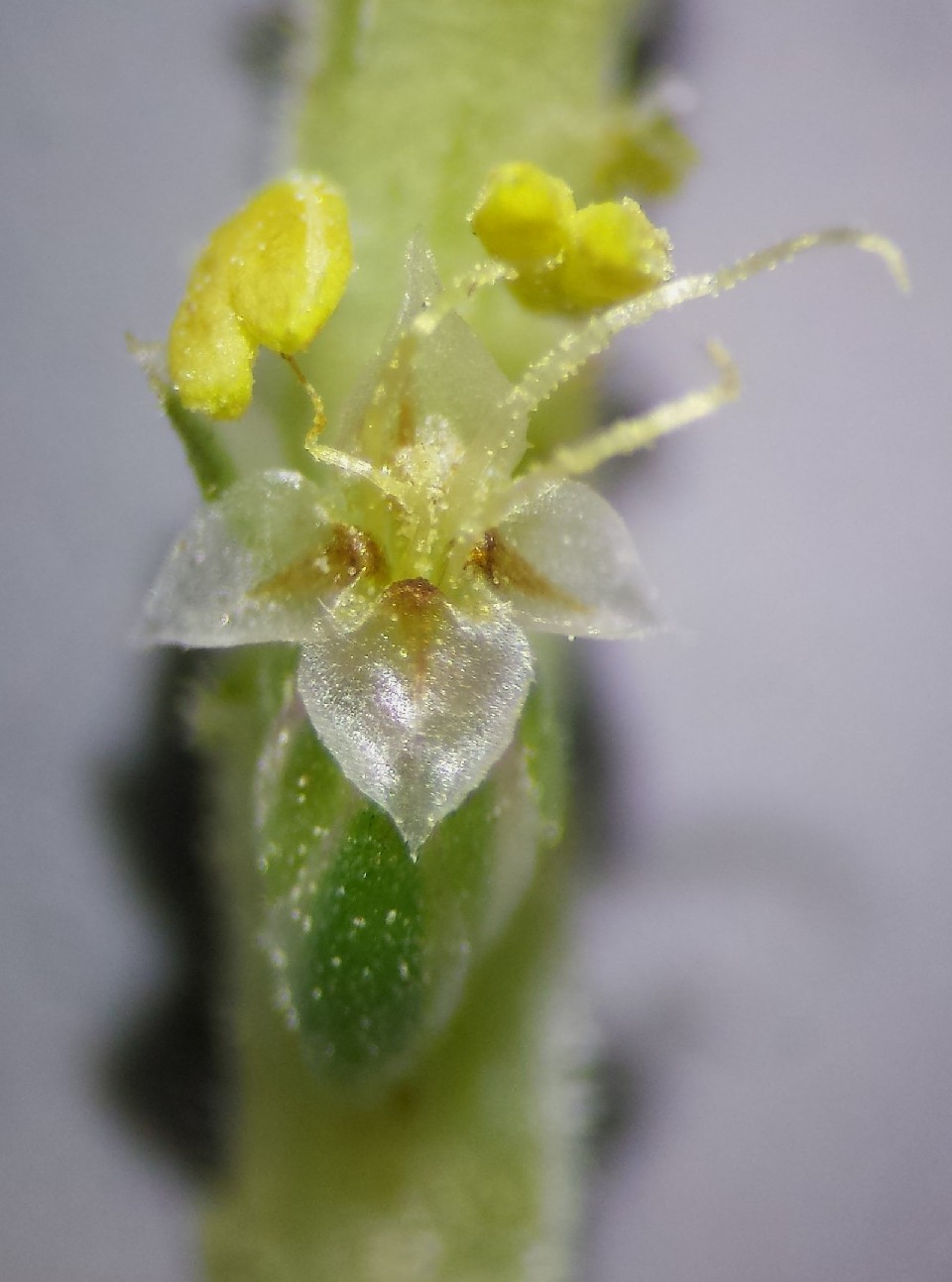Ährenstiel unter den Blüten behaart, Tragblätter eiförmig, 2 - 3 mm lang, 1,5 mm breit, spitz, kahl, Blüten mit bräunlich- häutiger, fein behaarter 2 - 3 mm langer Kronröhre und 4 Kronblattzipfeln, Kronblattzipfel 1,5 mm lang, spitz, mit braunem Mittelstreifen, kahl, Griffel bewimpert, Staubbeutel gelb, vordere Kelchblätter nur am Grund verwachsen, oval, ca. 2 mm lang, 1,2 mm breit, stumpf, kahl oder mit wenigen Wimpern, hintere Kelchblätter gekielt und undeutlich geflügelt