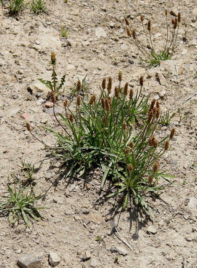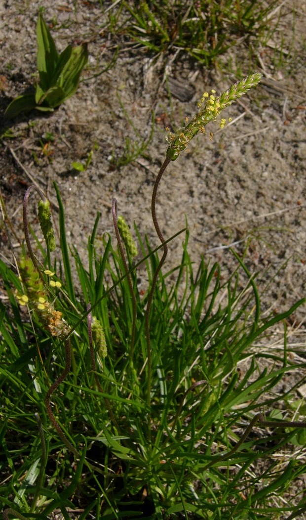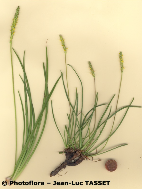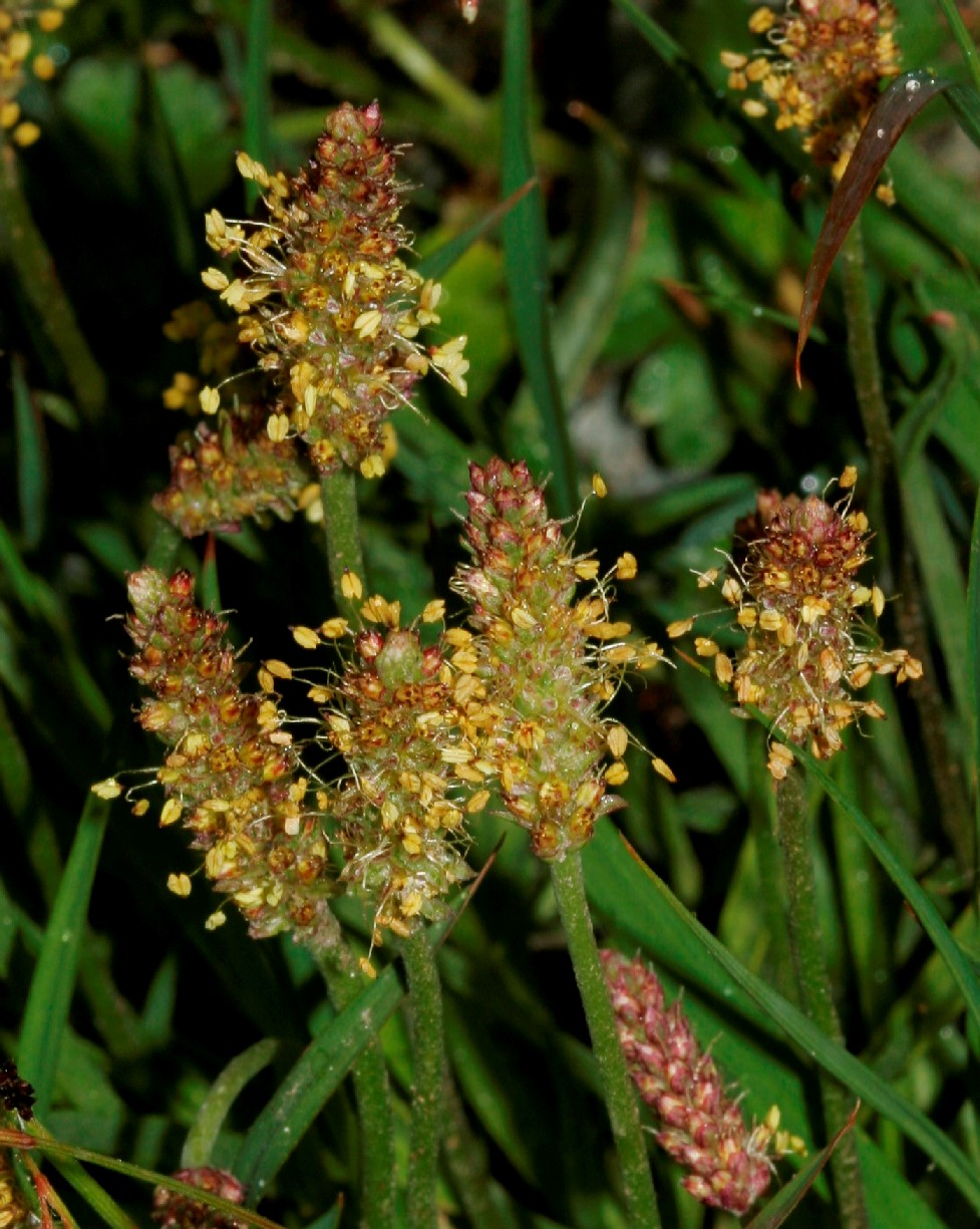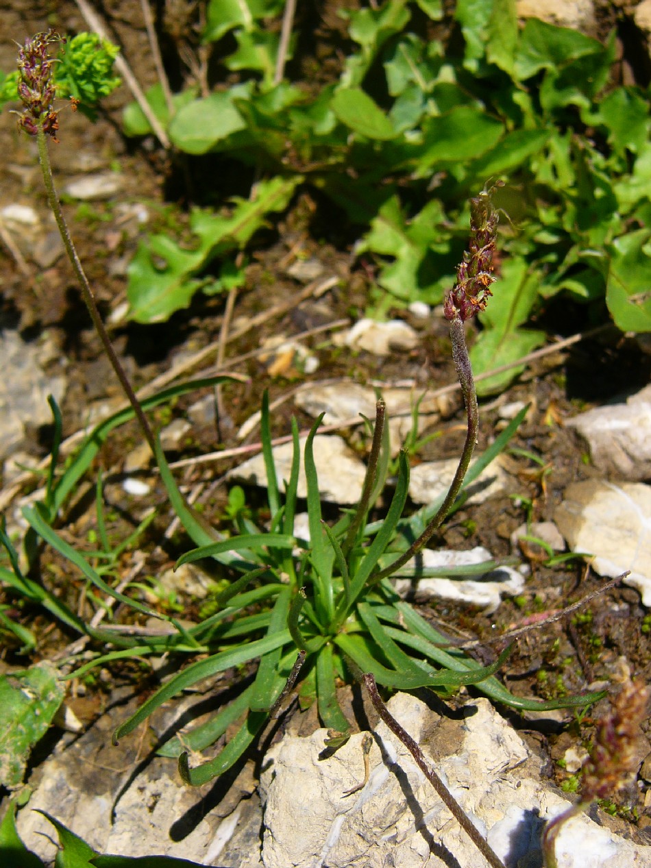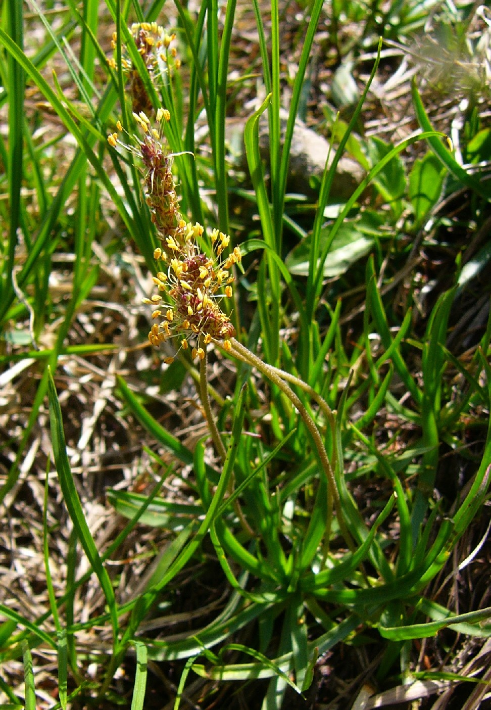 Plantago - Stängel ohne Blätter, Grundblätter breiter als 2 mm, lanzettlich - linealisch, +/- ganzrandig, nicht wollig behaart, mit undeutlichen Nerven, Tragblätter kürzer als die Blüten, kahl oder bewimpert, hinteres Kelchblatt schmal geflügelt
