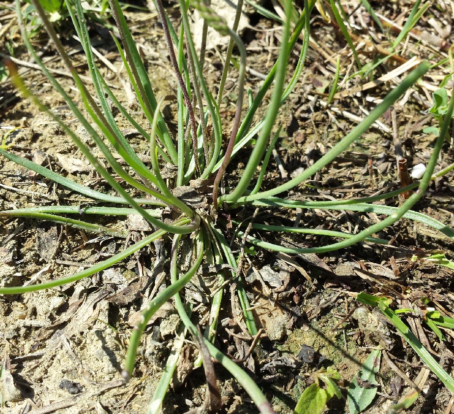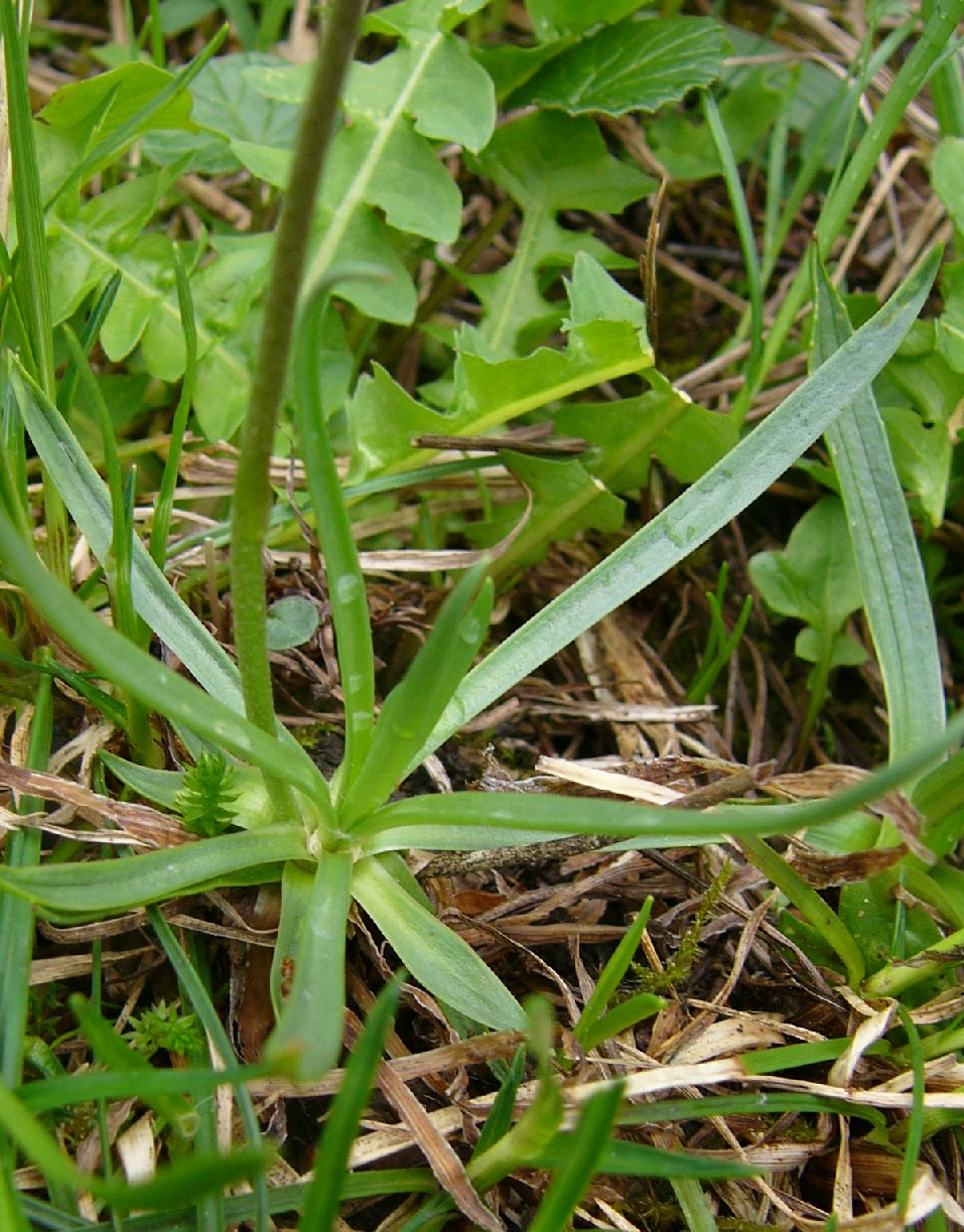 Grundblätter rosettig, aufrecht oder am Boden ausgebreitet, linealisch, kahl oder am Rand bewimpert, mit 1 - 3 undeutlichen Nerven, 50 - 200 mm lang, 2 - 10 mm breit, flach oder rinnig, ganzrandig, beim Trocknen schwarz werdend