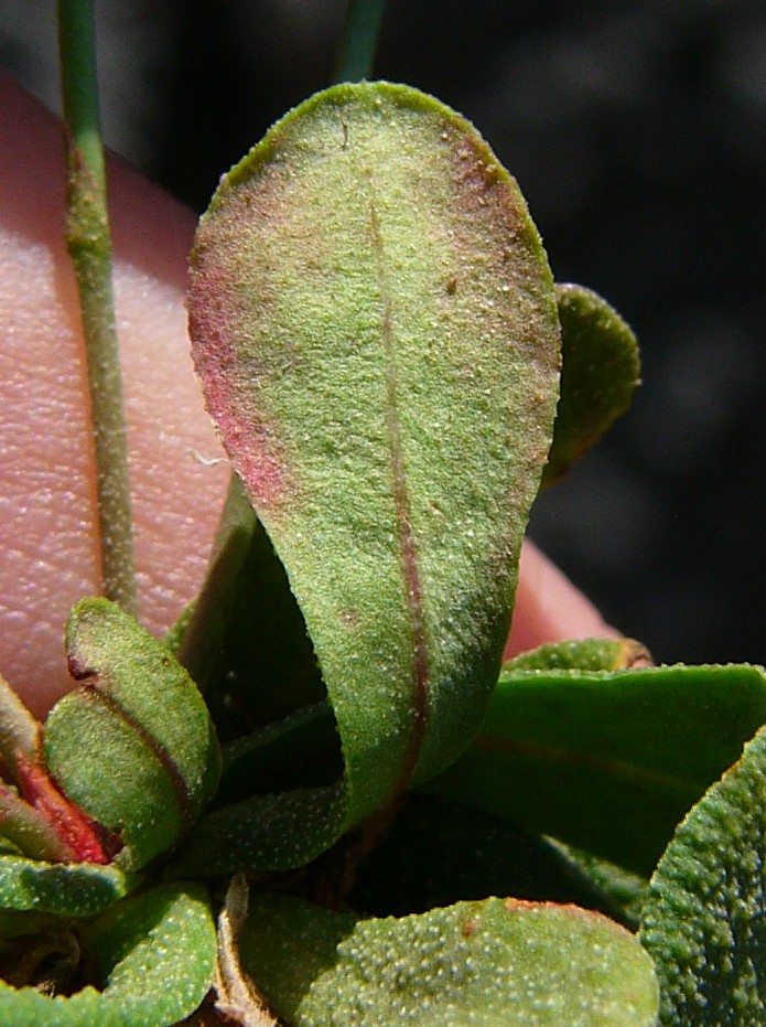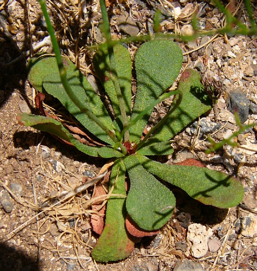 Blätter 10 - 30 mm lang, 4 - 8 mm breit, steif, fleischig, warzig- drüsig, spatelig, vorne +/- stumpf, allmählich in den Stiel verschmälert, Wurzelstock verholzt