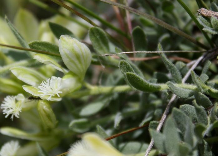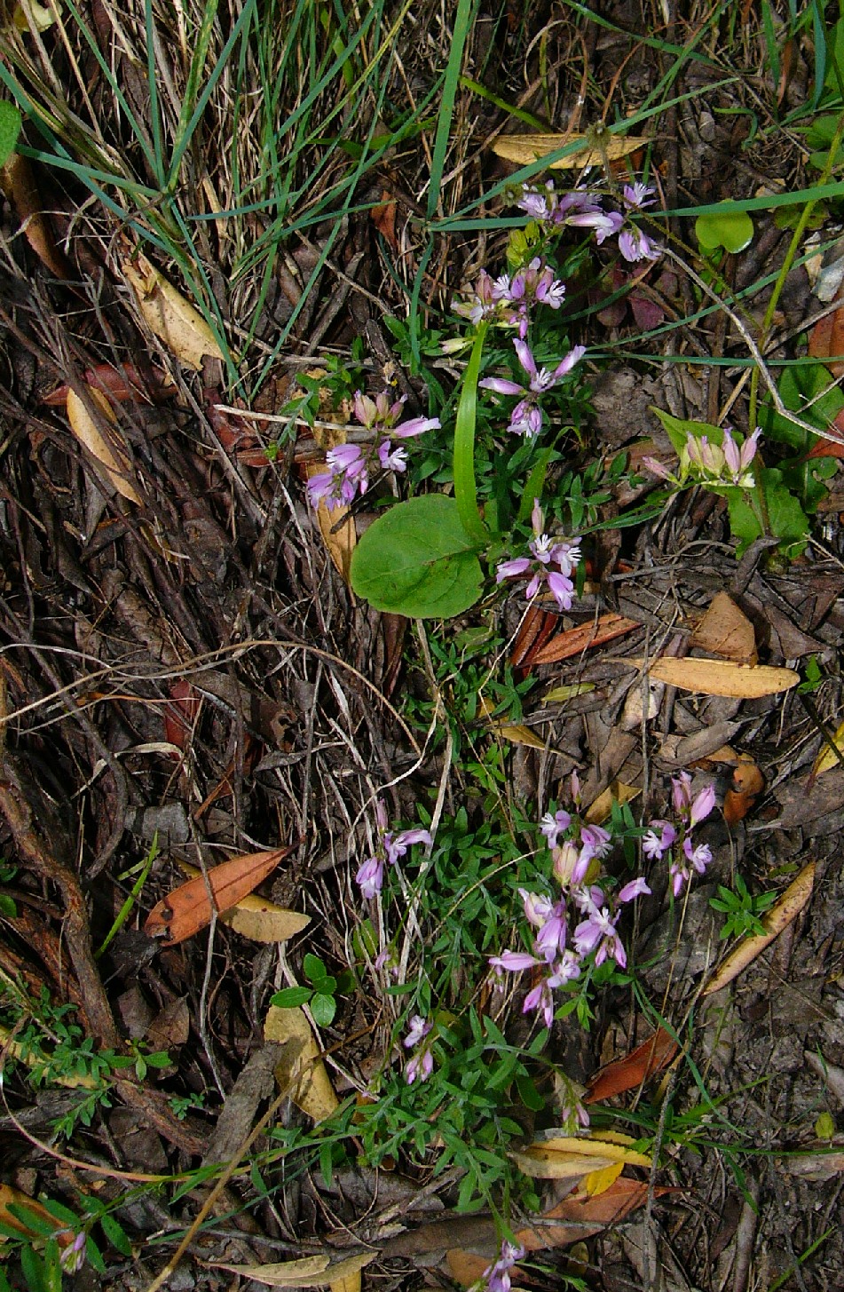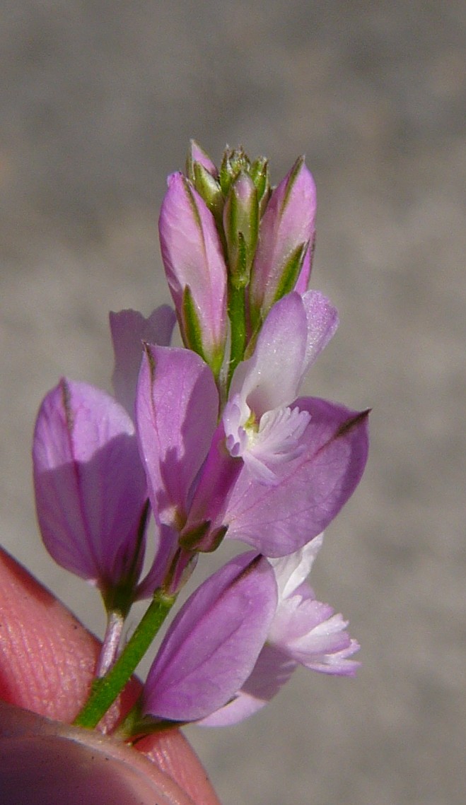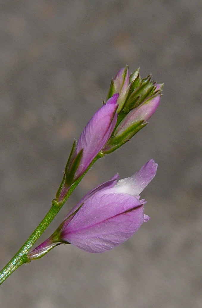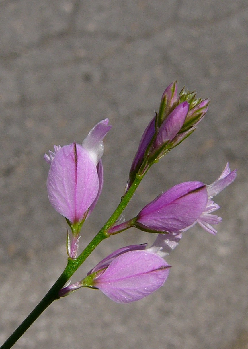 Polygala- Blüten blau, weißlich oder rosaviolett, mit fädlichen Anhängseln, Krone nicht S- förmig gebogen, so lang oder kürzer als die Flügel, untere Stängelblätter wechselständig, kleiner als die oberen, Blätter und Stängel dicht behaart