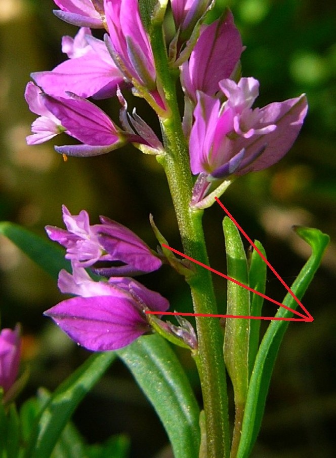 Polygala- Blüten blau, weißlich oder rosaviolett, mit fädlichen Anhängseln, Krone nicht S- förmig gebogen, so lang oder kürzer als die Flügel, untere Stängelblätter wechselständig, kleiner als die oberen, Stängel und Blätter hal oder angedrückt behaart