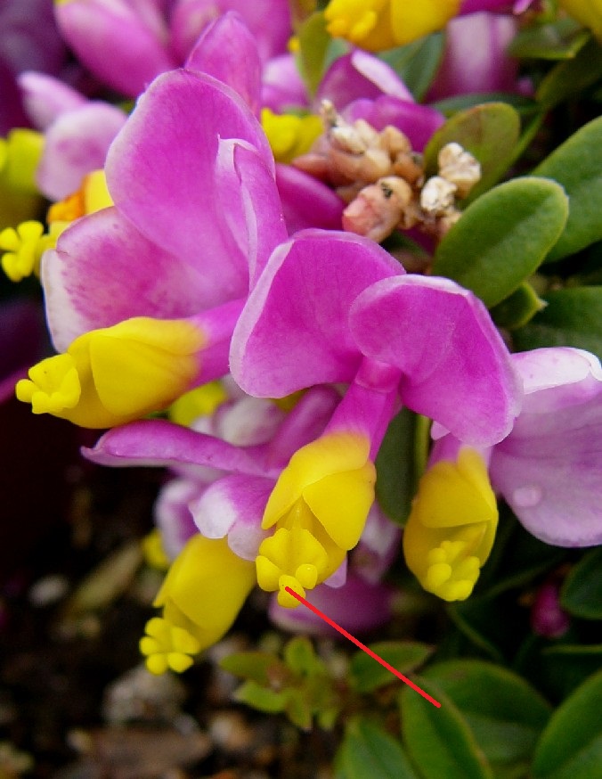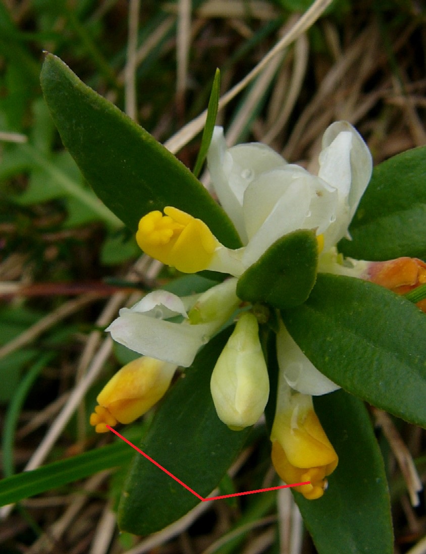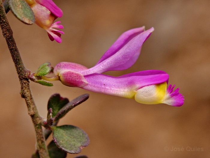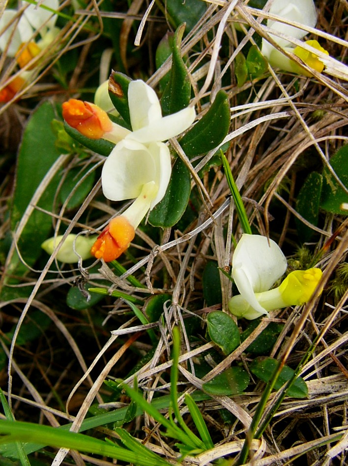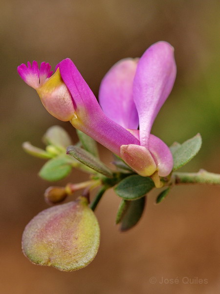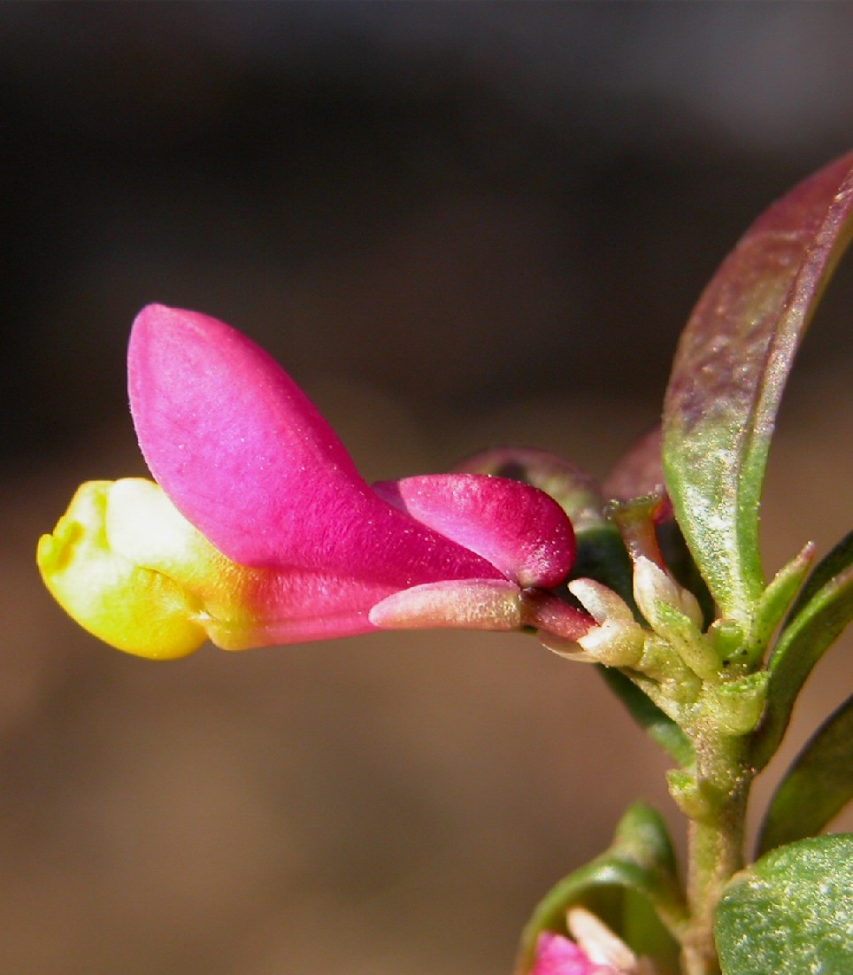 5 - 15 cm großer immergrüner Halbstrauch Blüten einzeln oder zu zweien Schiffchen im unteren Teil weiß oder rosa, Anhängsel des Schiffchens nicht fädlich, mit 2 - 6 kurzen Zipfeln Kelch aus 5 ungleich gestaltet Kelchblättern: Das oberste Kelchblatt ist +/- gespornt, die beiden unteren sind kleiner