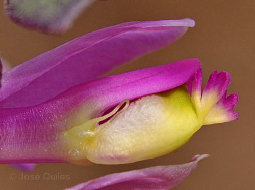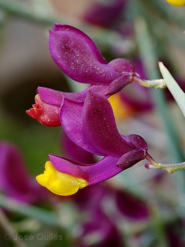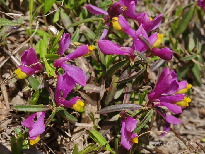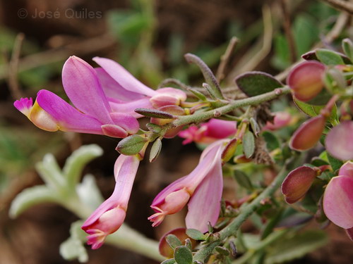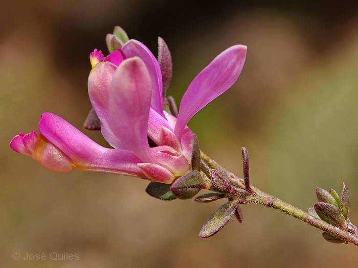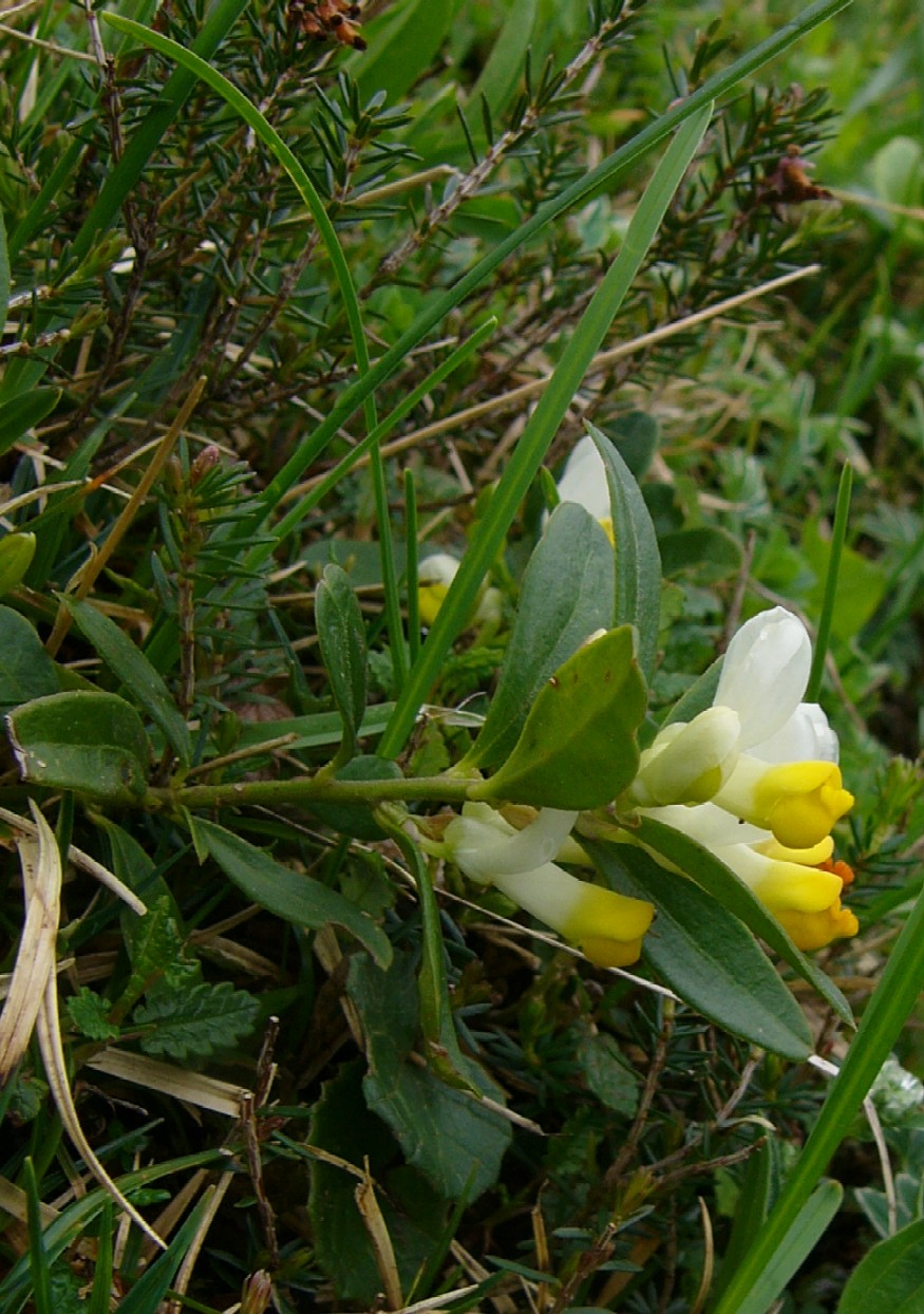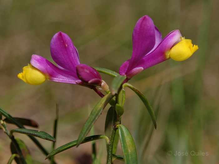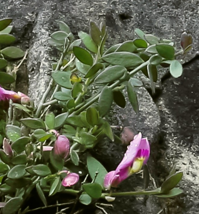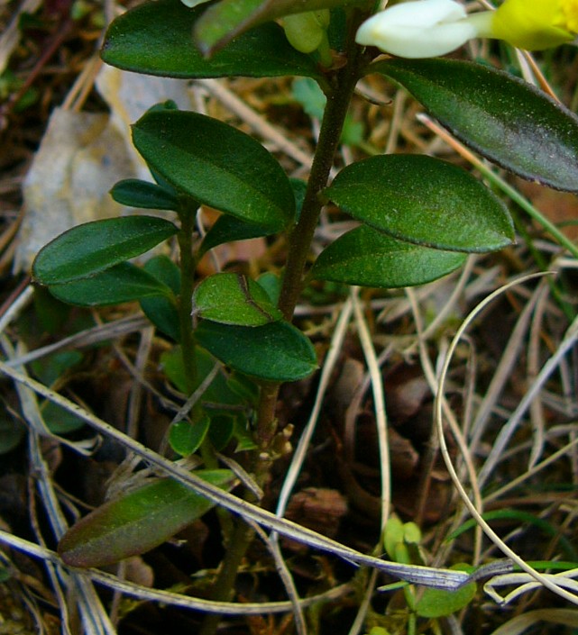 5 - 15 cm großer immergrüner Halbstrauch Blüten einzeln oder zu zweien Schiffchen im unteren Teil weiß oder rosa, Anhängsel des Schiffchens nicht fädlich, mit 2 - 6 kurzen Zipfeln Kelch aus 5 ungleich gestaltet Kelchblättern: Das oberste Kelchblatt ist +/- gespornt, die beiden unteren sind kleiner