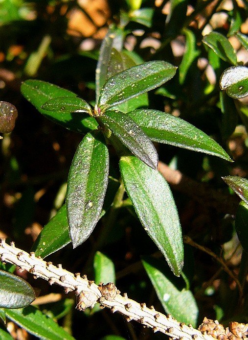 Blätter linealisch, ledrig, ohne Stacheln, Stängel verholzt