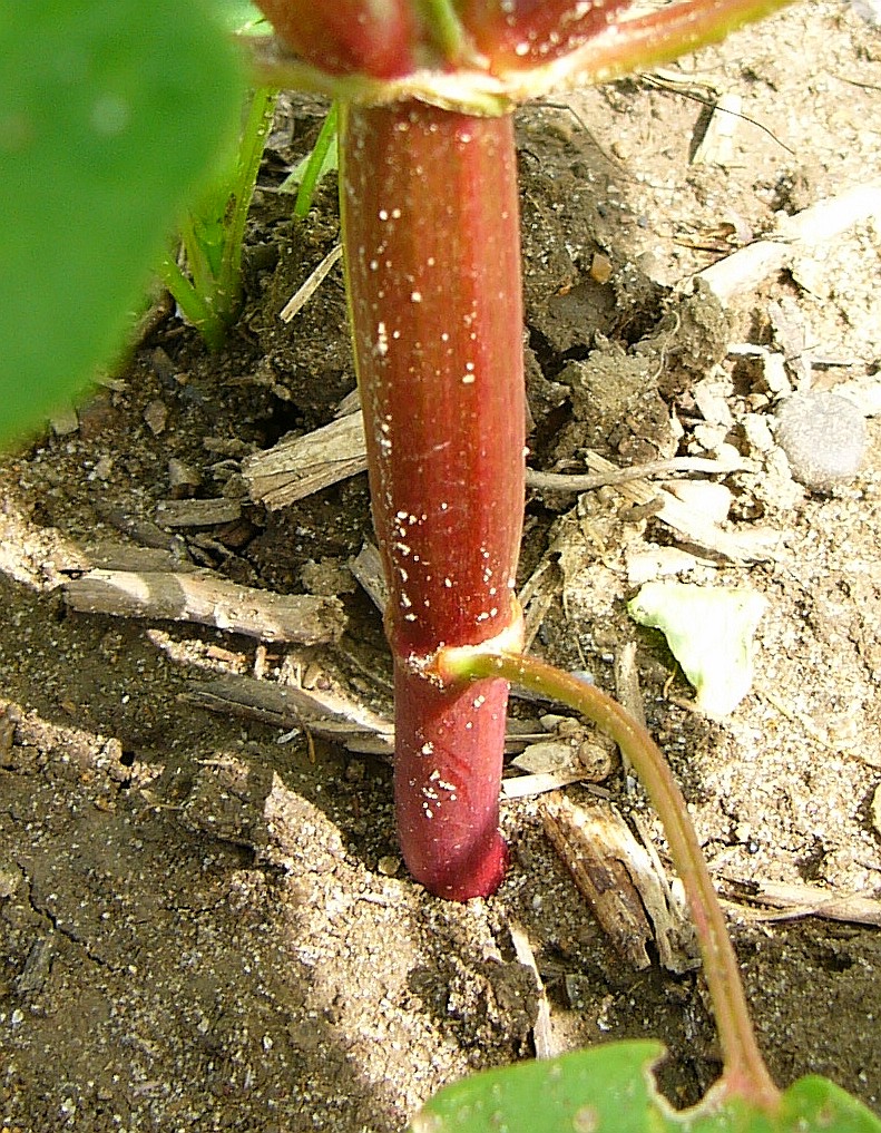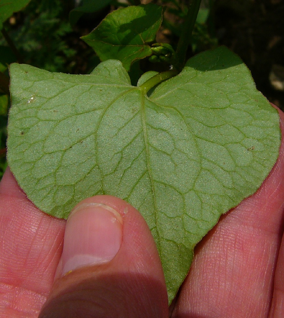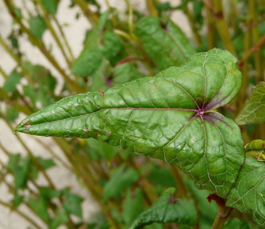 Stängel zur Reifezeit rot überlaufen Blätter +/- dreieckig, 1 - 5 cm lang gestielt Blattspreite 3 - 7 cm lang, 2 - 5 cm breit, an der Basis herzförmig oder gestutzt beiderseits +/- kahl