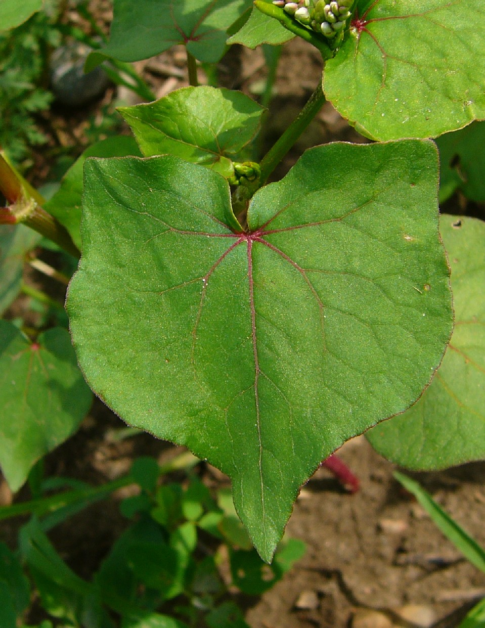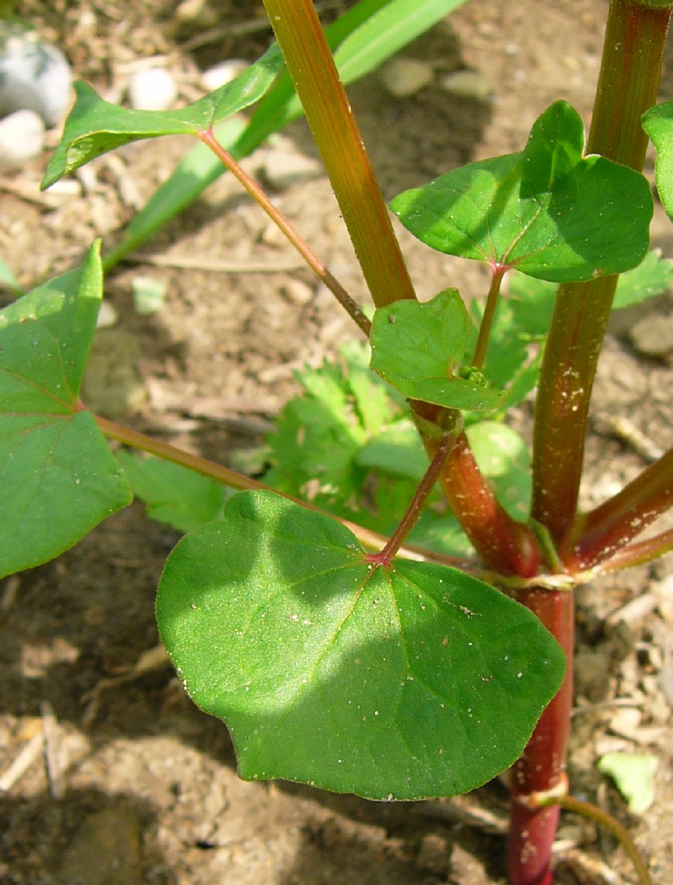 Blätter +/- dreieckig, lang gestielt Blattspreite 3 - 7 cm lang, 2 - 5 cm breit, an der Basis herzförmig oder gestutzt