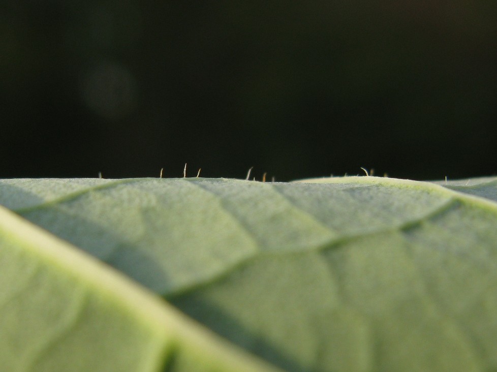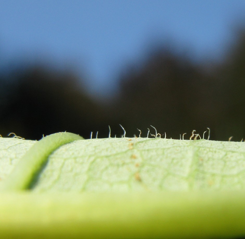 Blätter, besonders die Blattadern der Blattunterseite sind mit weiß-gräulichen, ca. 1 mm langen Haaren besetzt