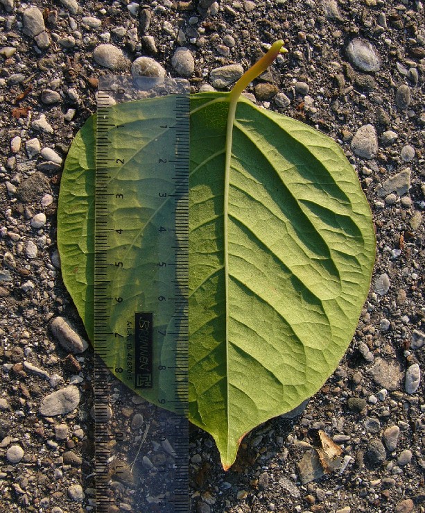 Blätter 5 - 13 cm lang, 5 - 10 cm breit, eiförmig, Basis der