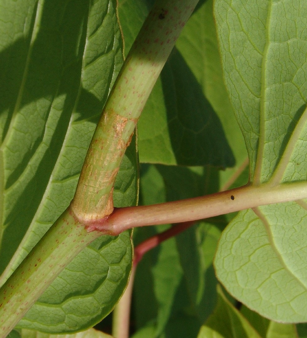 Stängel aufrecht, kräftig, derb, hohl, unverholzt, deutlich rot gefleckt