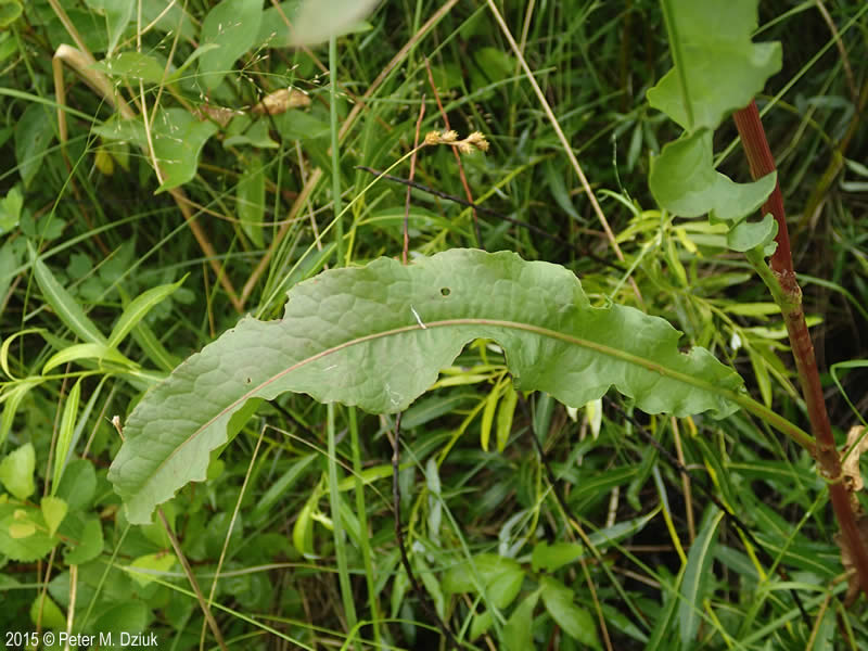 Untere Blätter elliptisch bis rhombisch, Blattspreite 15 - 35 cm lang, 5 - 12 cm breit, ca. doppelt so lang wie breit, am Grund keilig, vorne +/- spitz, Ränder wellig- kraus, unterseits nicht papillös, Blattstiel weniger als halb so lang wie die Blattspreite