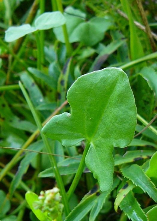 Untere Blätter spießförmig, 10 - 35 mm lang, 5 - 20 mm breit, geigenförmig, spieß- oder pfeilförmig, mit abstehenden Basallappen