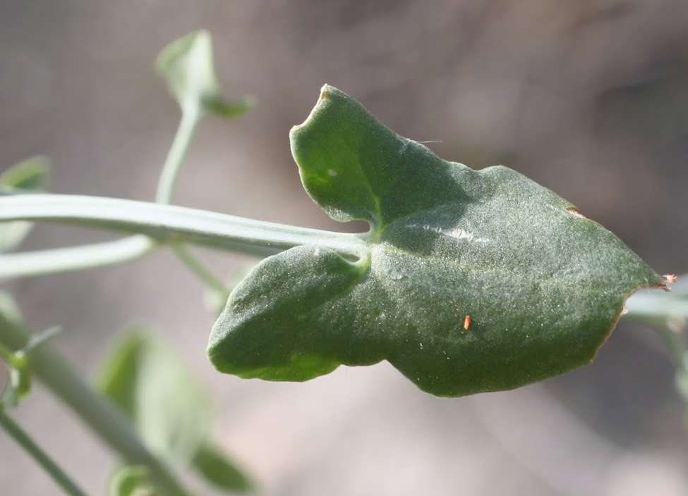 Blattspreite dreieckig, blaugrün, fleischig, kahl, am Rand fein gezähnelt, lang gestielt