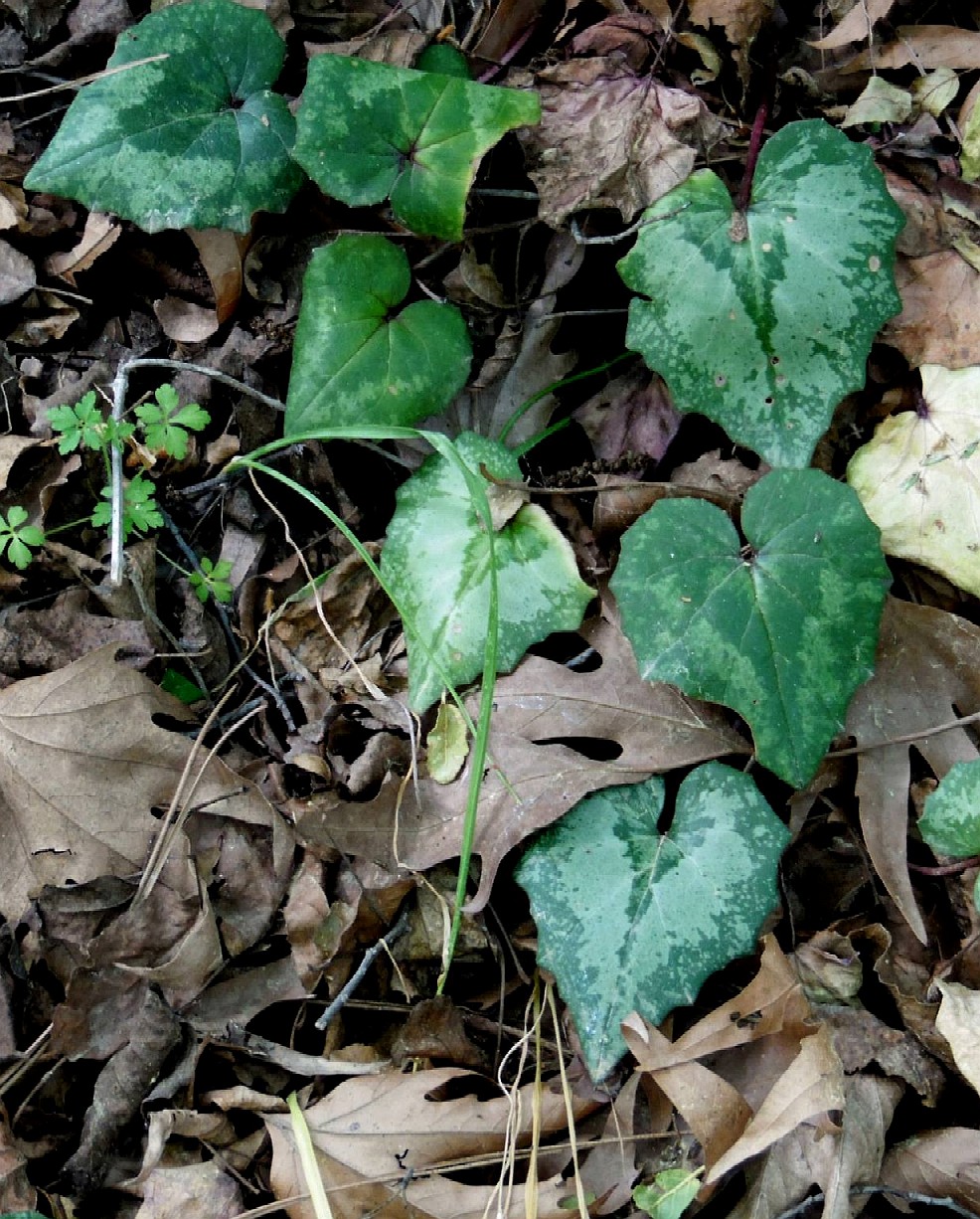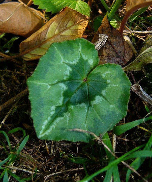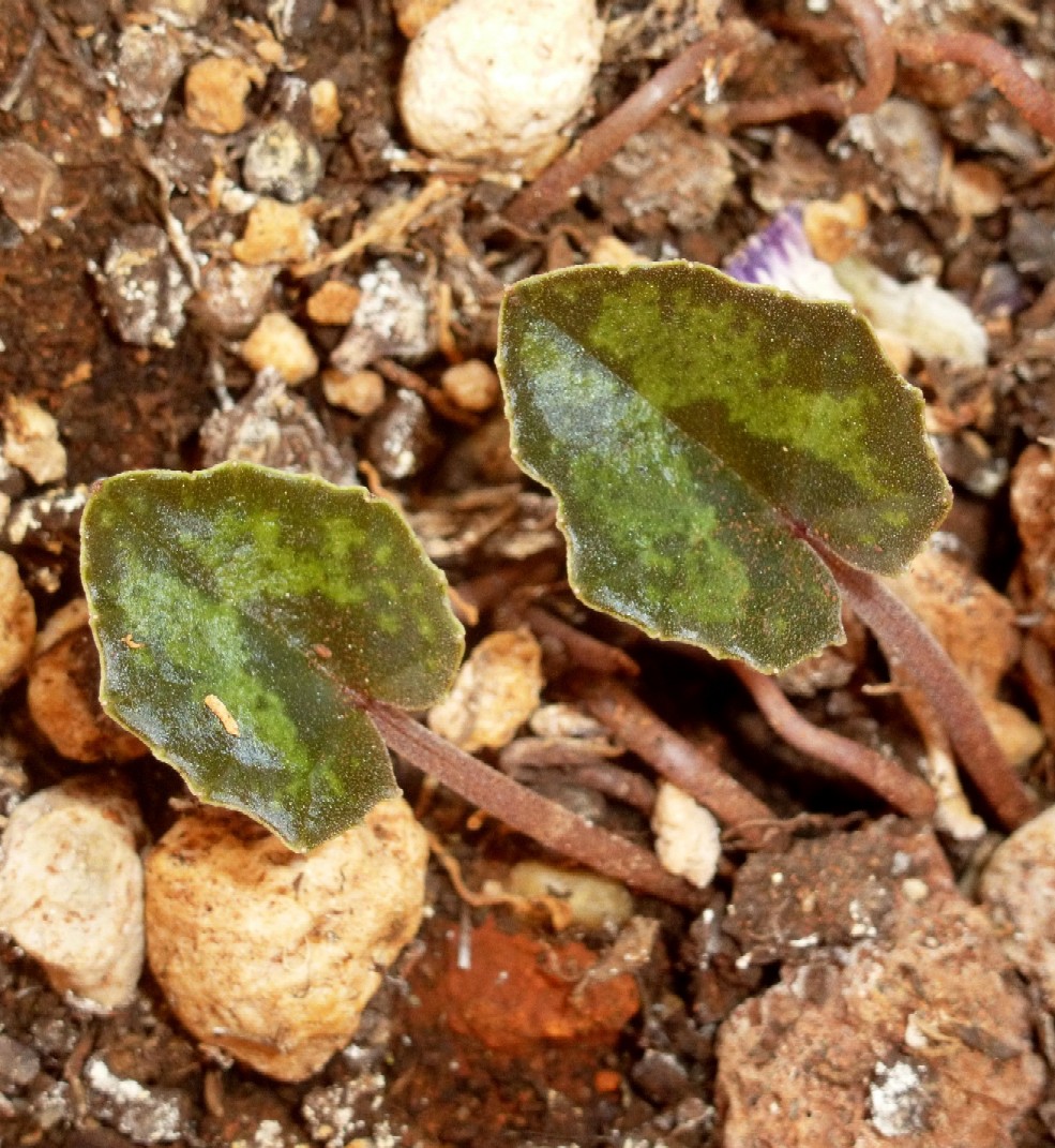 Blütenblätter zurückgeschlagen Kronzipfel geöhrt, rosa Kronzipfel am Grund mit V-förmiger Zeichnung Kelchblätter ganzrandig Fruchtstiele rollen sich von oben nach unten auf Blätter rundlich- herzförmig, eckig, mit weißer Maserung Knolle in der oberen Hälfte bewurzelt
