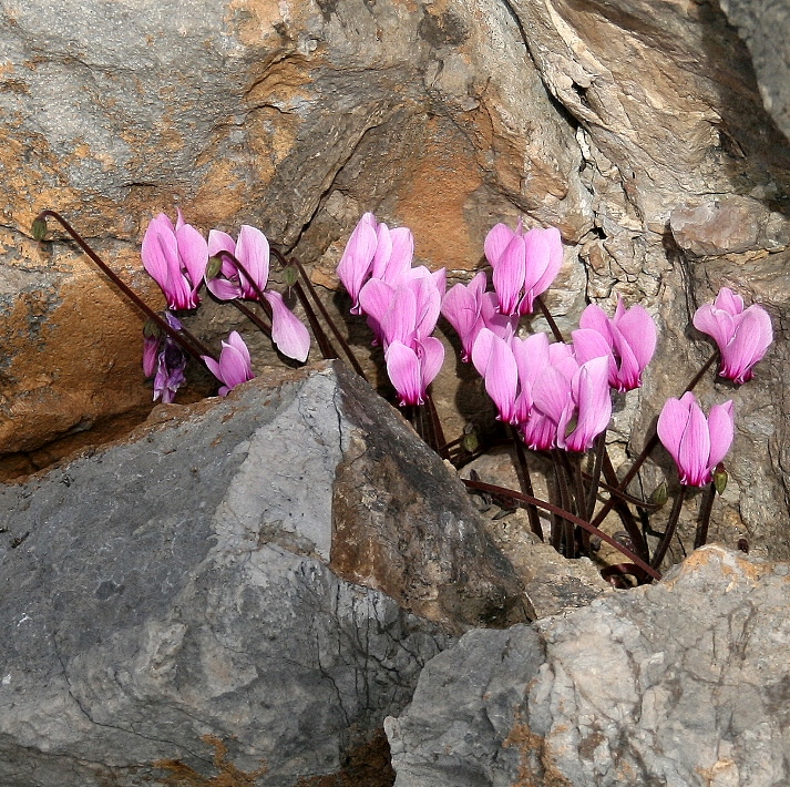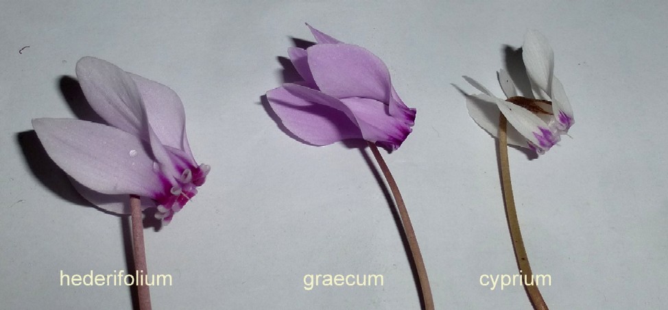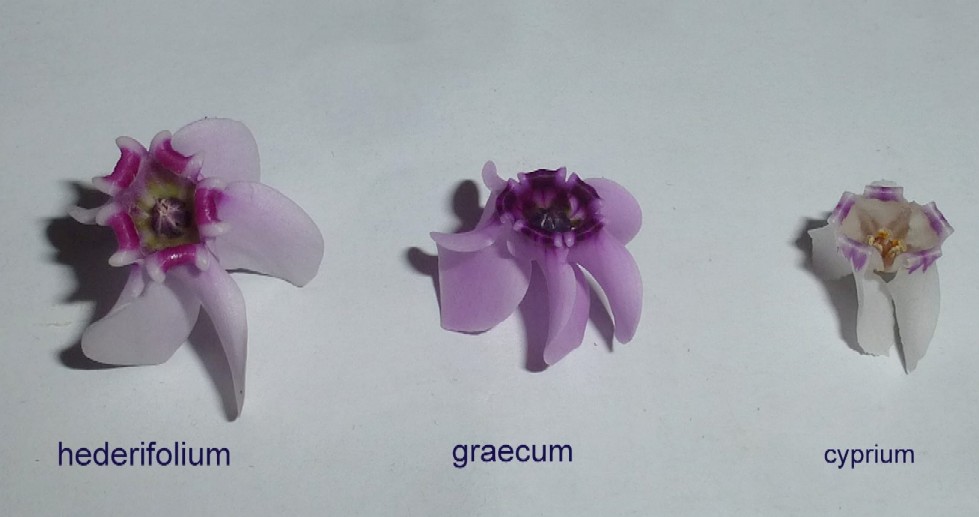 VIII - XI, Felsen Synonyme: English name: Weltweite Verbreitung: Vergleich der Blüten von Cyclamen hederifolium, Cyclamen graecum und Cyclamen cyprium: