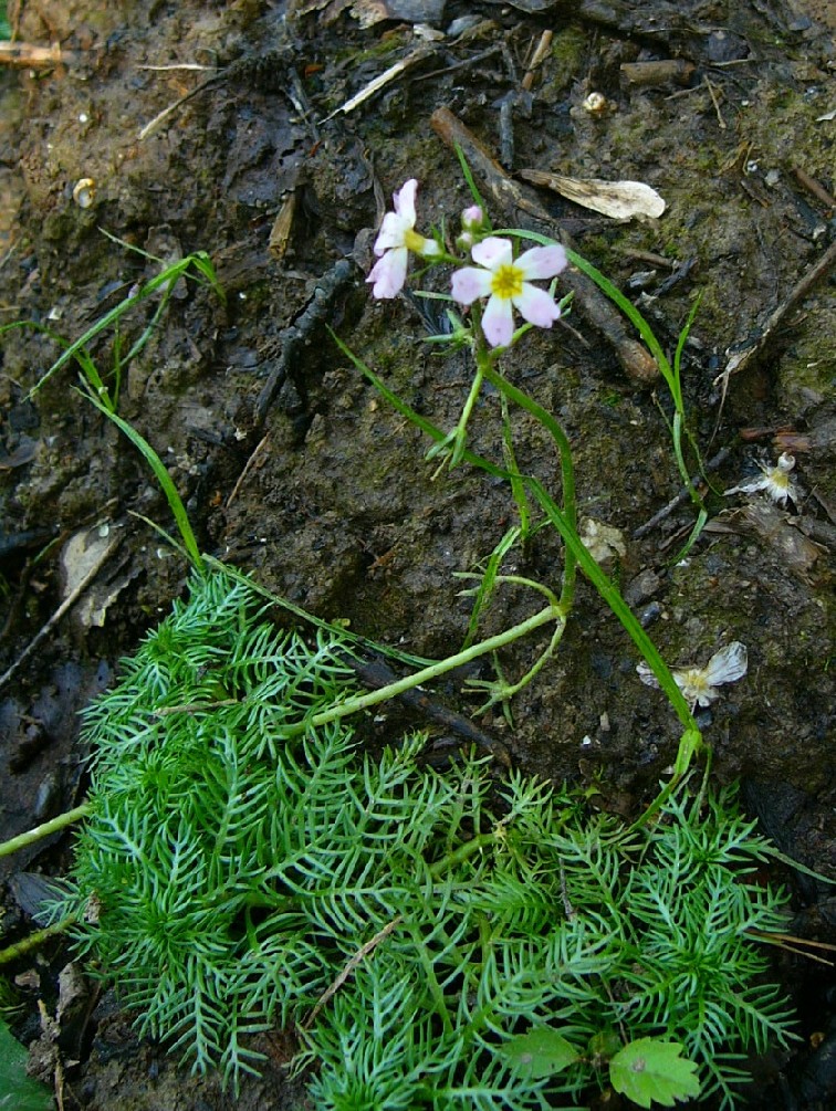 Pflanze 15 - 50 cm groß, im Schlamm wurzelnd Blütenstände ragen aus dem Wasser, Blüten zu 3-6 blattachselständig, in etagenartig angeordneten Quirlen, Krone helllila bis weiß Blätter untergetaucht, bis 8 cm lang, rosettig genähert, kammförmig gefiedert