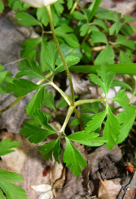 Die 3 Hochblätter quirlständig, lang gestielt, aus je 3 Blättchen bestehend, Blättchen eingeschnitten oder fiederspaltig