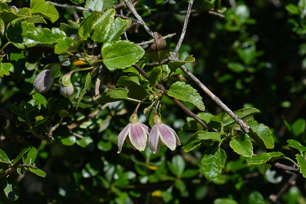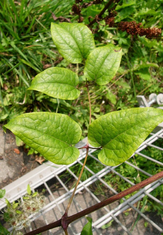 Clematis- Pflanze kletternd, Blüten weiß oder violett überlaufen