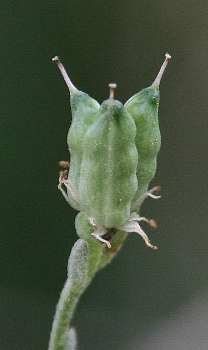 Balgfrüchte zu 3, 6 - 10 mm lang, 3 - 4 mal so lang wie breit, abstehend behaart
