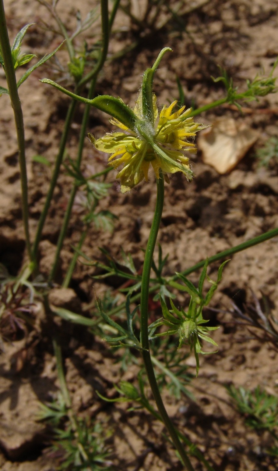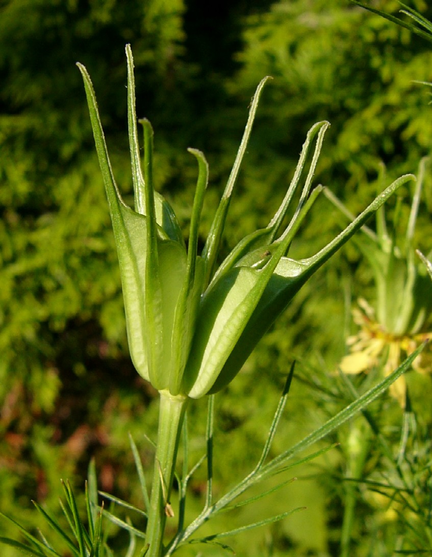 verwachsen, Balgfrüchte an der Bauchseite aufbrechend Früchte rundlich, flach Blätter 2 - 3- fach fiederteilig mit lineal- fadenförmigen Abschnitten