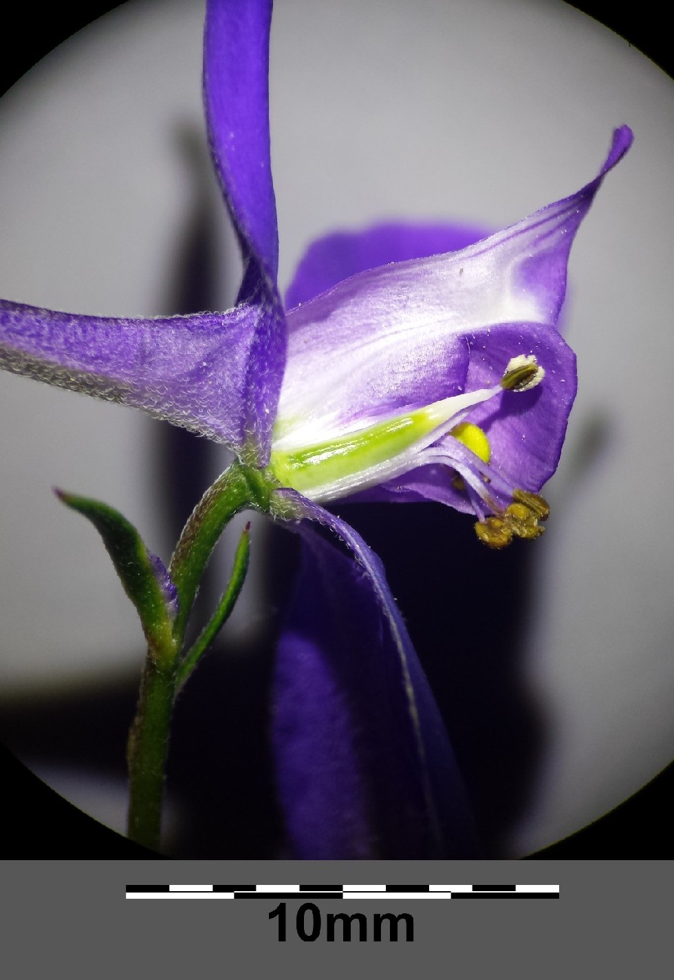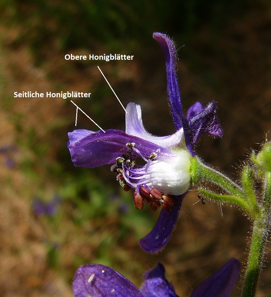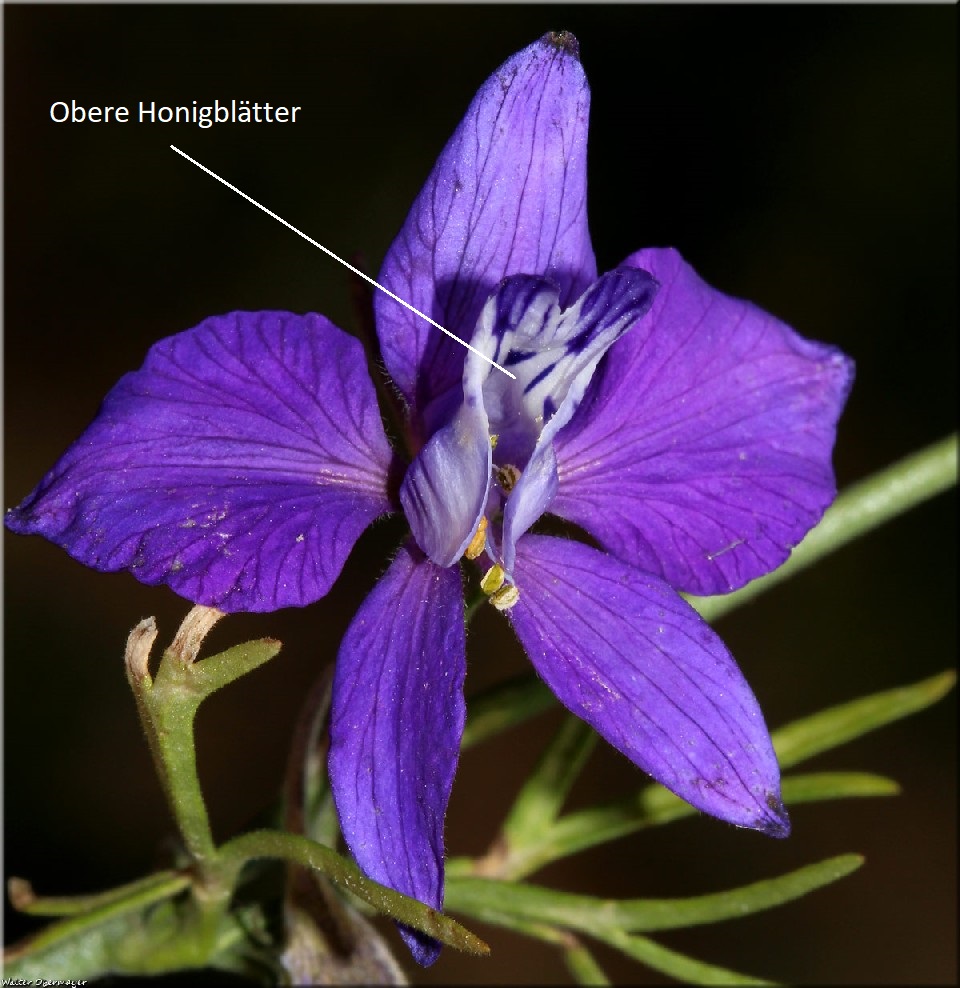 Die oberen beiden Honigblätter (eng. nectaries ) sind ebenfalls zu einem Sporn verwachsen, der von dem Sporn der Perigonblätter umgeben wird, während die seitlichen Honigblätter frei sind (3 Perigonblätter wurden entfernt)