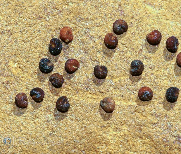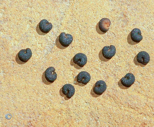 Samen 0,6 - 1,2mm lang, nierenförmig, schwarz, papillös