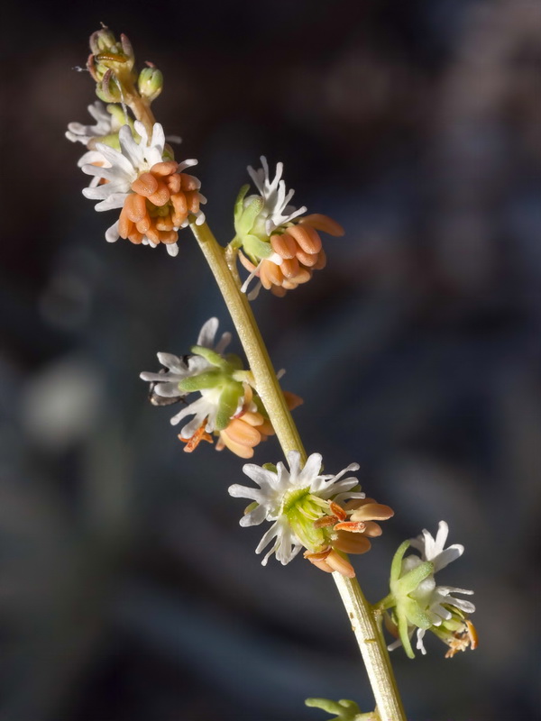 Blüten mit 5 - 6 weißen Kronblättern, Kronblätter weiß, Nagel 1/2 - 1/3 so lang wie das Kronblatt, Lippe 3- lappig, meist mit 15 Staubblättern, die c. so lang wie die Kronblätter sind, mit 5 - 6 Kelchblättern, Kelchblätter 3 mm lang, bleibend